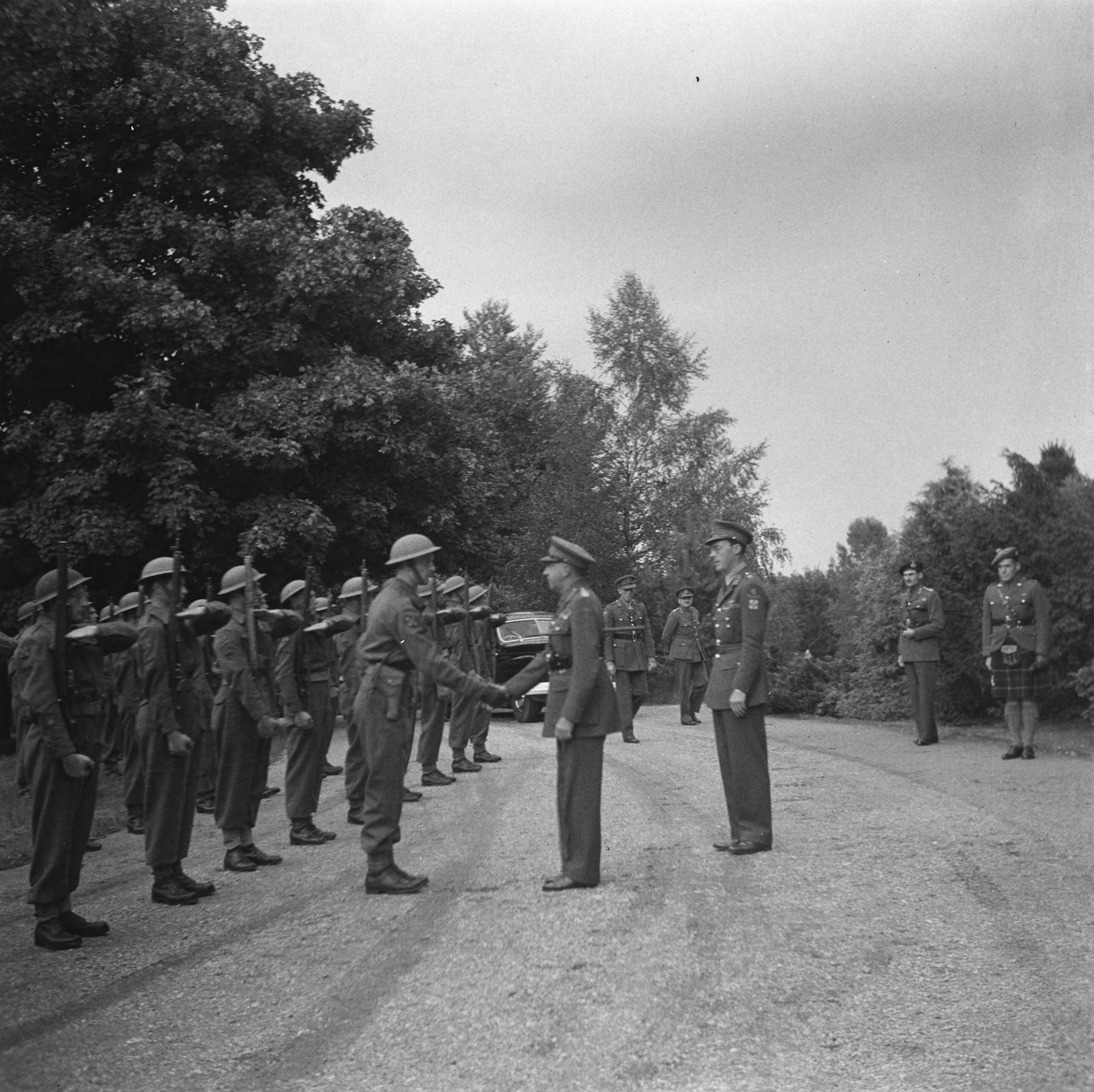 Prins Bernhard reikt het Grootkruis in de Orde van Oranje-Nassau met de Zwaarden uit aan de Canadese generaal Crerar. De generaal begroet de erewacht in Apeldoorn