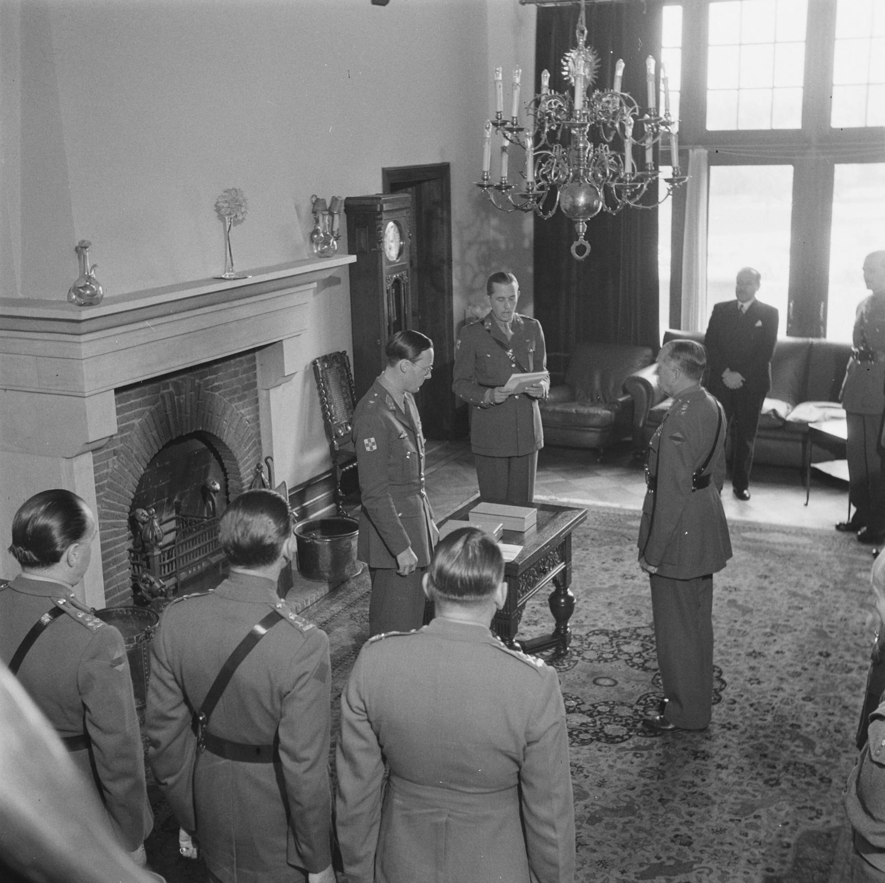 Prins Bernhard reikt het Grootkruis in de Orde van Oranje-Nassau met de Zwaarden uit aan de Canadese generaal Crerar