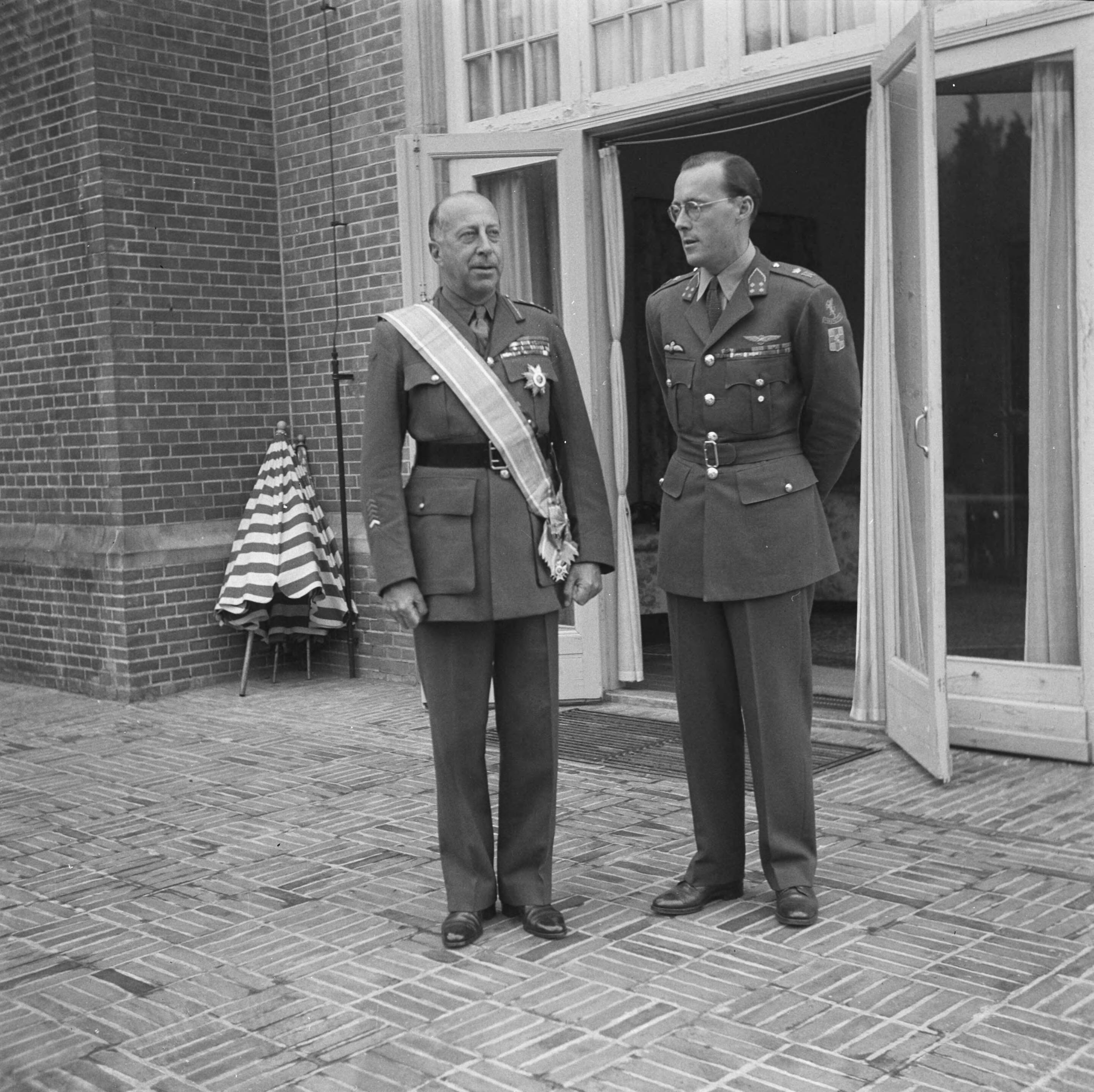 Prins Bernhard met de Canadese generaal Crerar aan wie het het Grootkruis in de Orde van Oranje-Nassau met de Zwaarden heeft uitgereikt