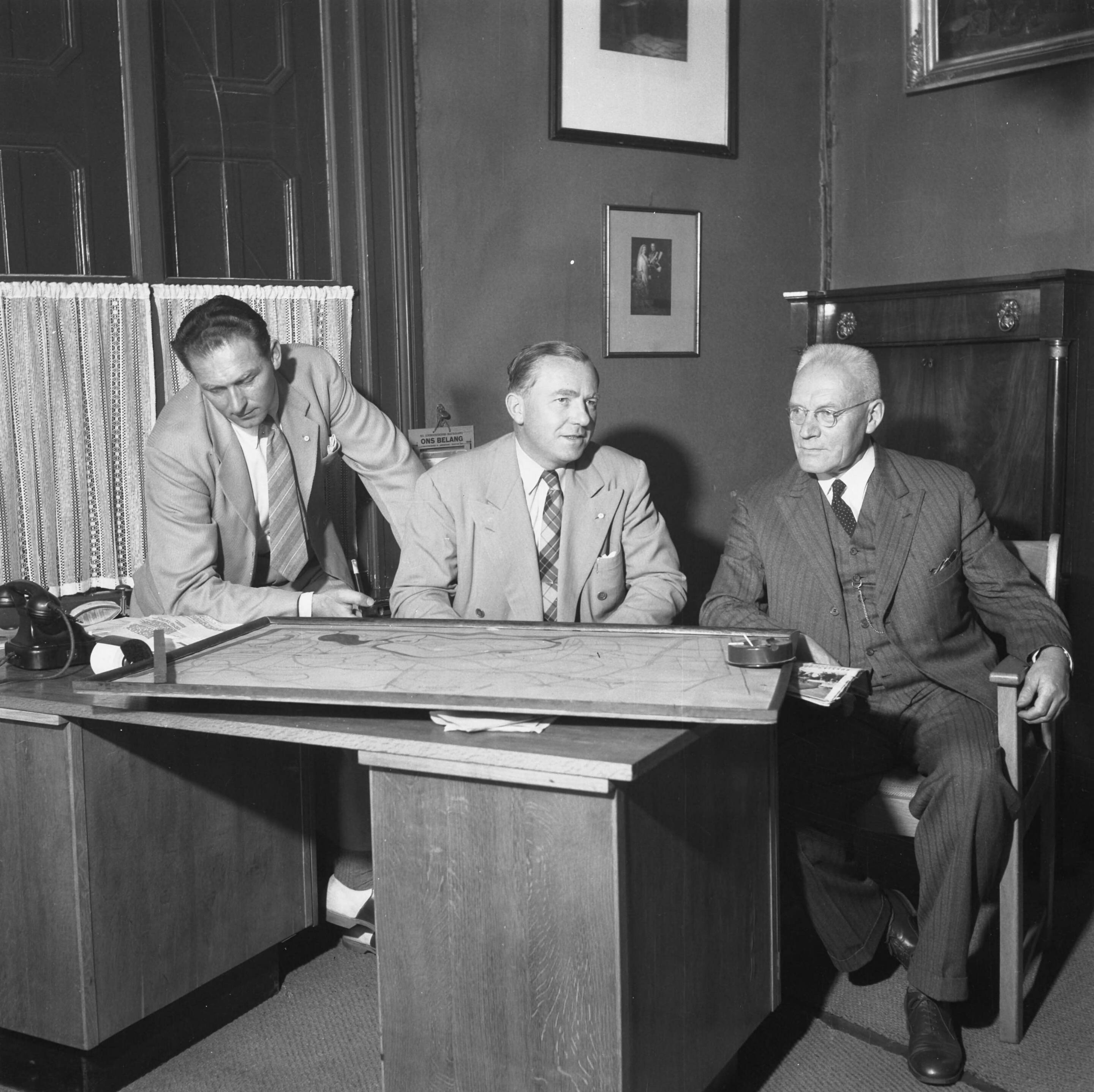Drie mannen zitten in een kantoor, met voor hen een ingelijste kaart