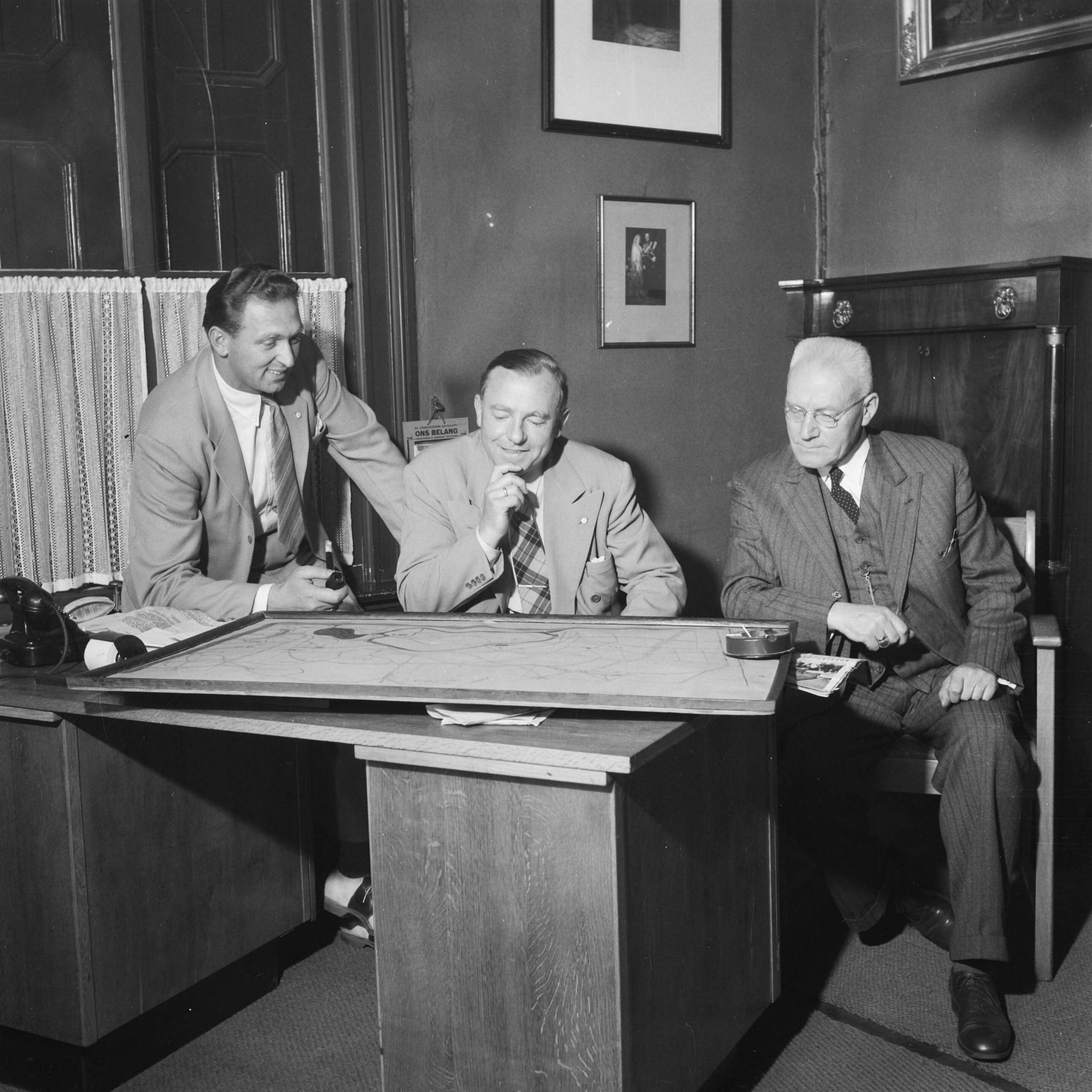 Drie mannen zitten in een kantoor, met voor hen een ingelijste kaart