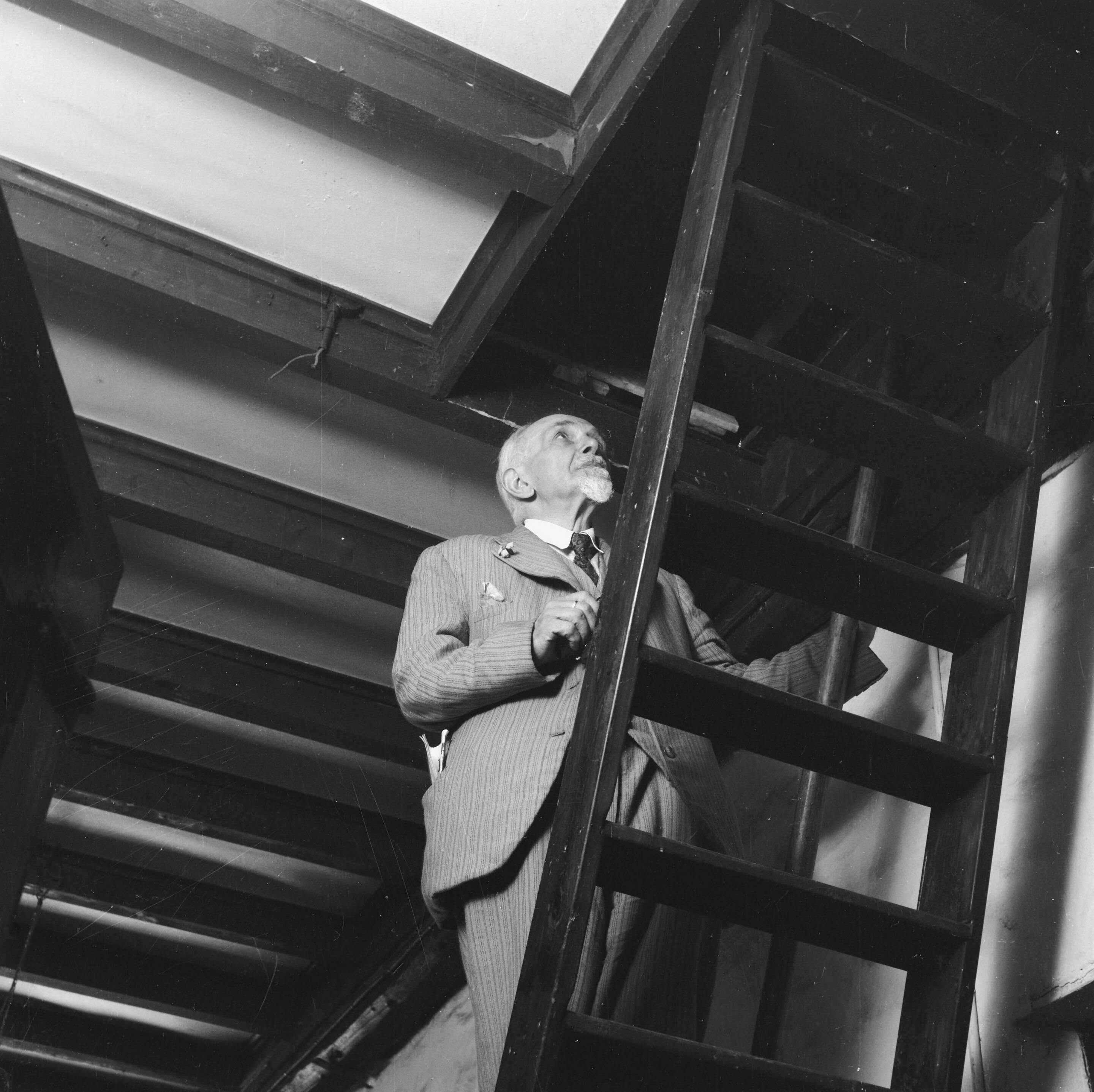 Een man met snor en puntbaard beklimt een trap naar een zolderverdieping