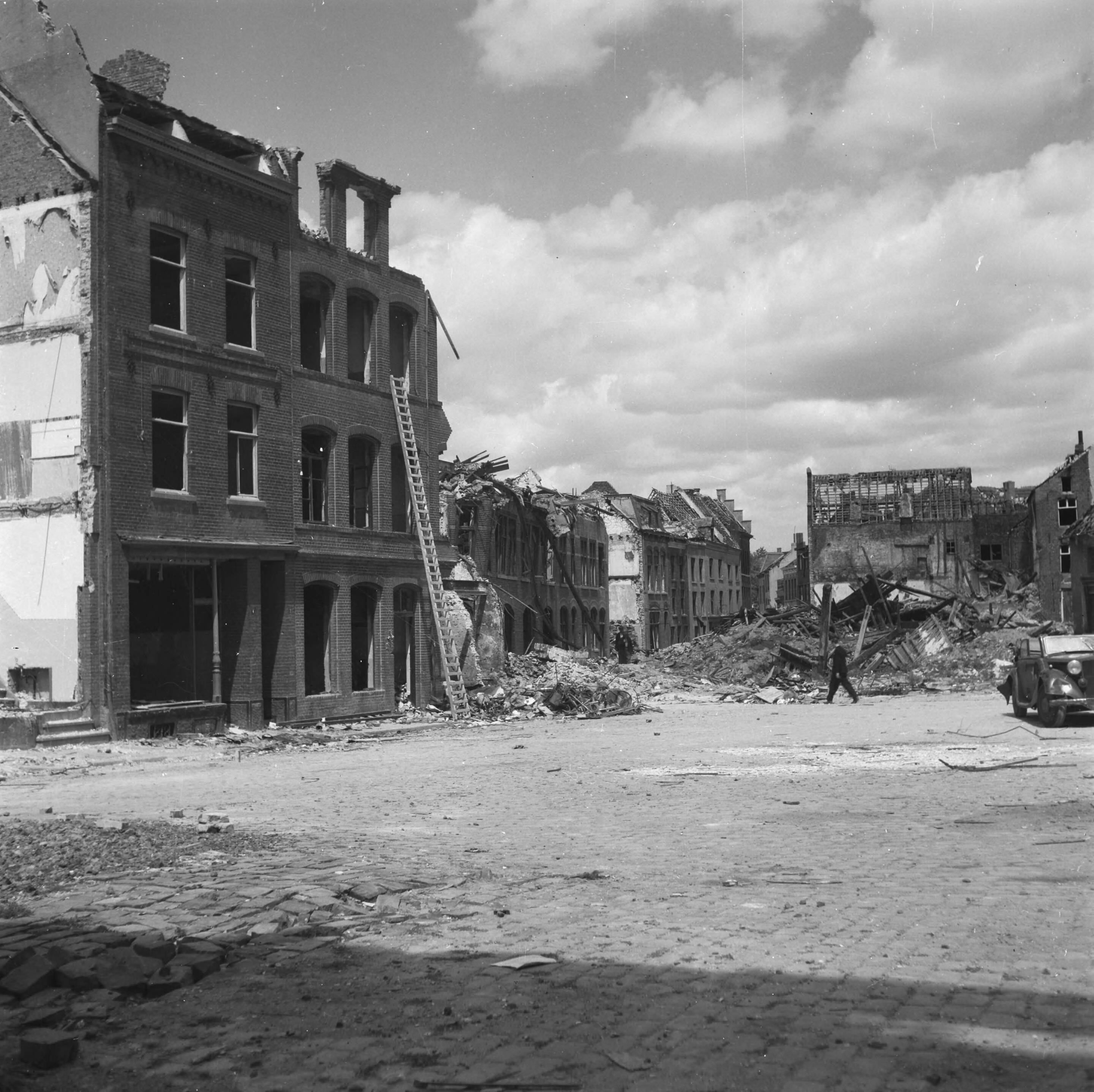 Vernielingen Venlo. Oude Markt met inkijk op de Maasstraat.