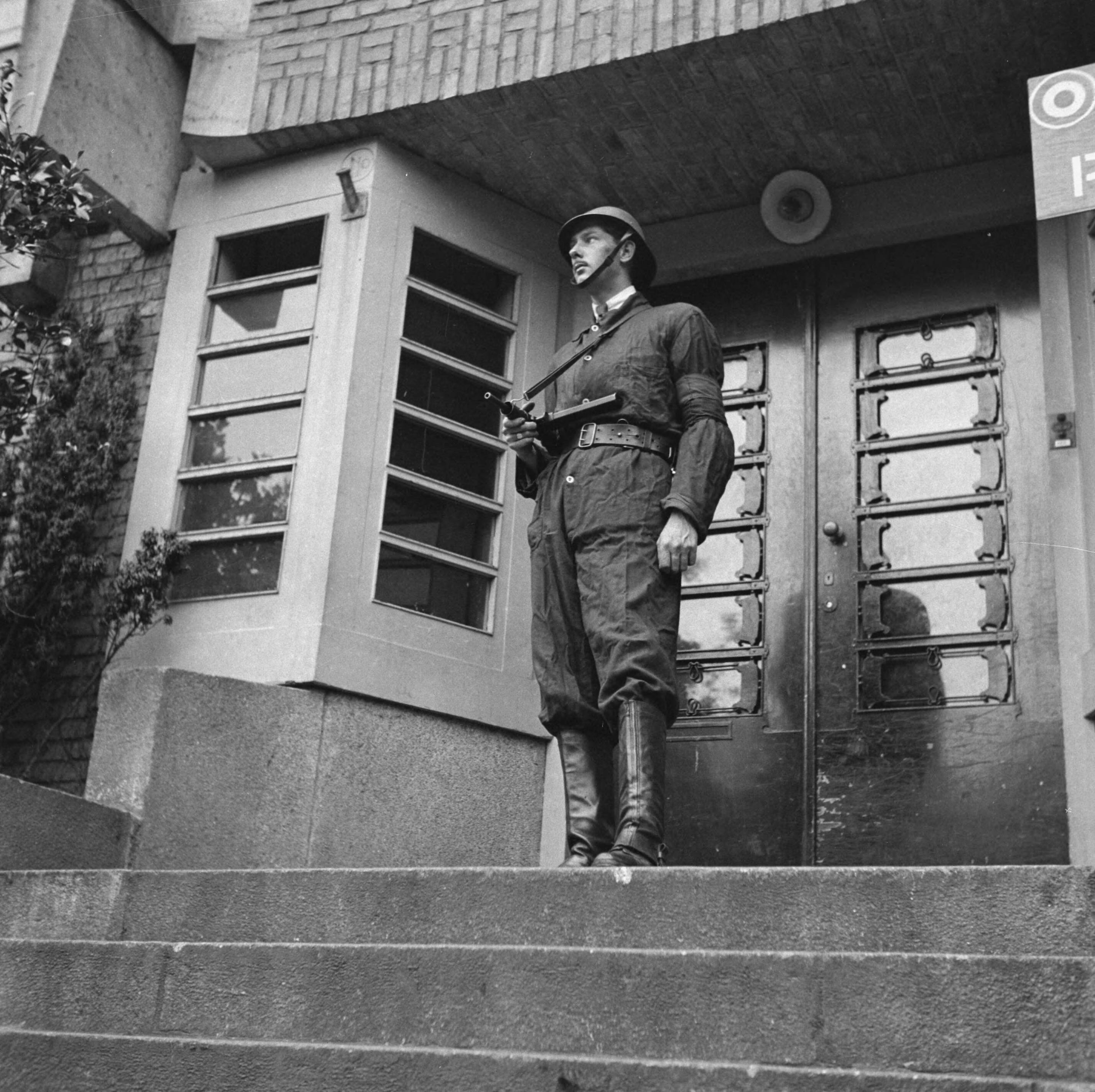 Oorlogsvrijwilligers melden zich aan bij het Aanmeldingsbureau voor Oorlogsvrijwilligers aan het Museumplein te Amsterdam