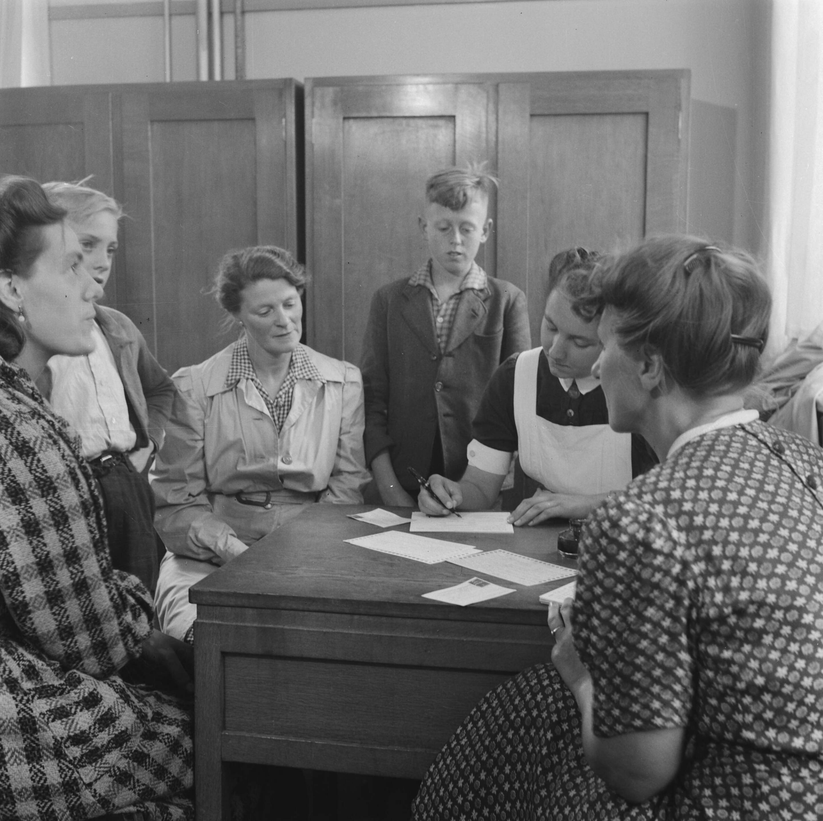 Moeders en zoons geschaard om een bureau waarachter een verpleegster gegevens noteert