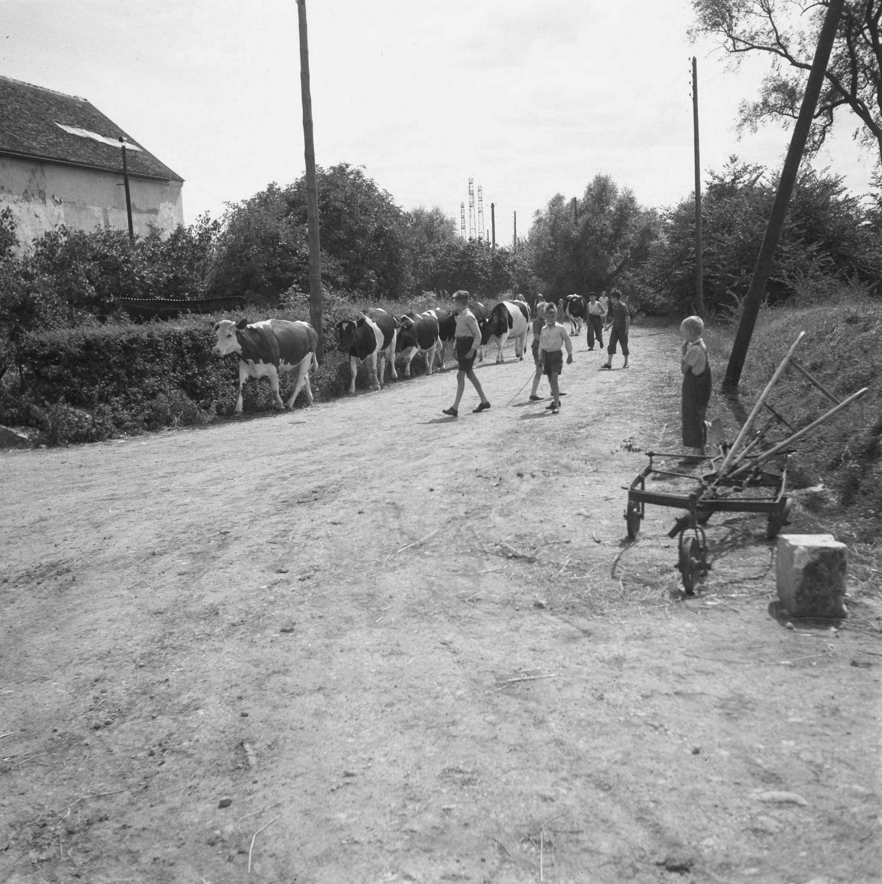 Koeien lopen in een rij over een landweg, begeleid door kinderen