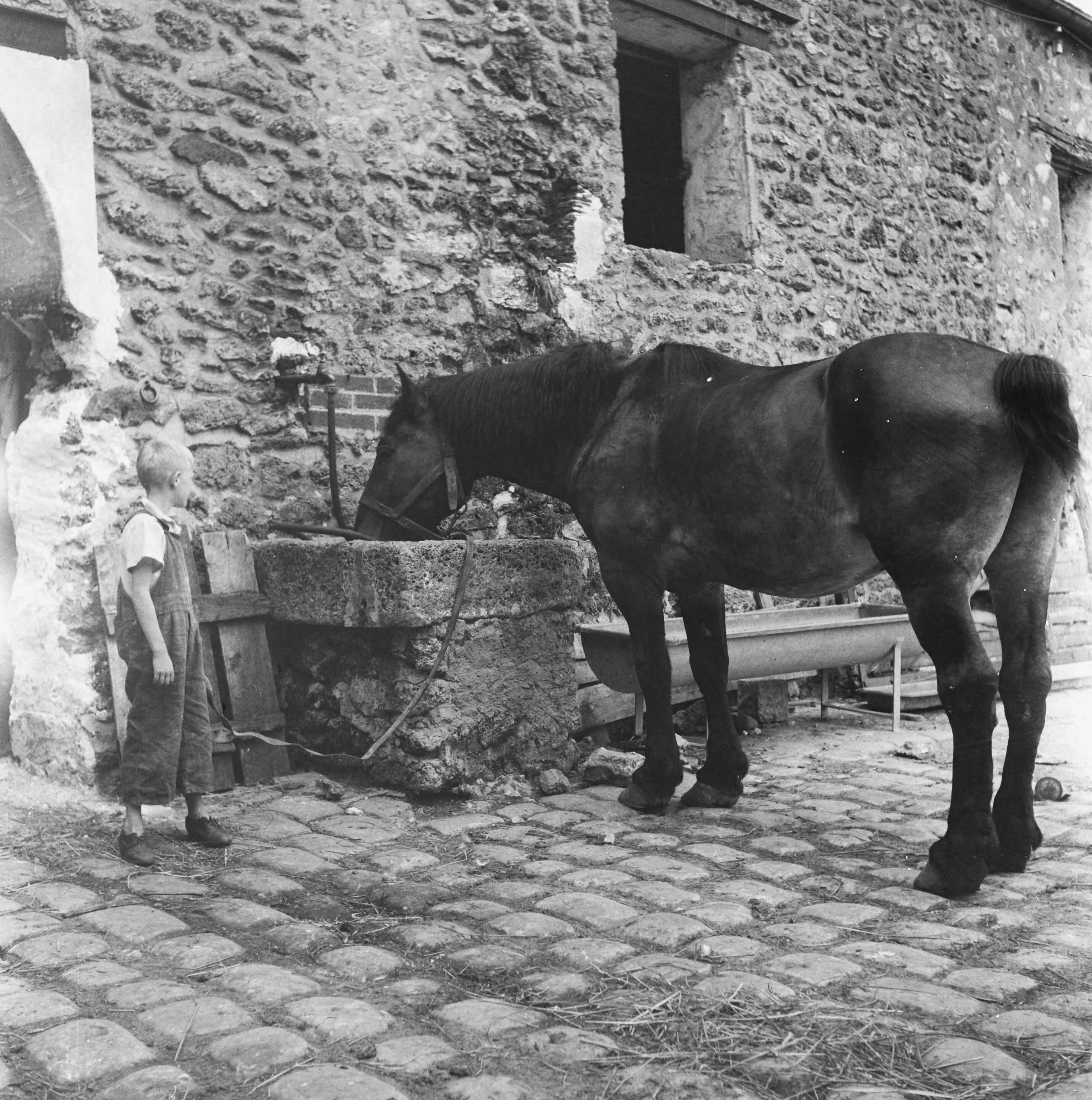Een paard drinkt uit een stenen bak. LInks kijkt een jonge toe