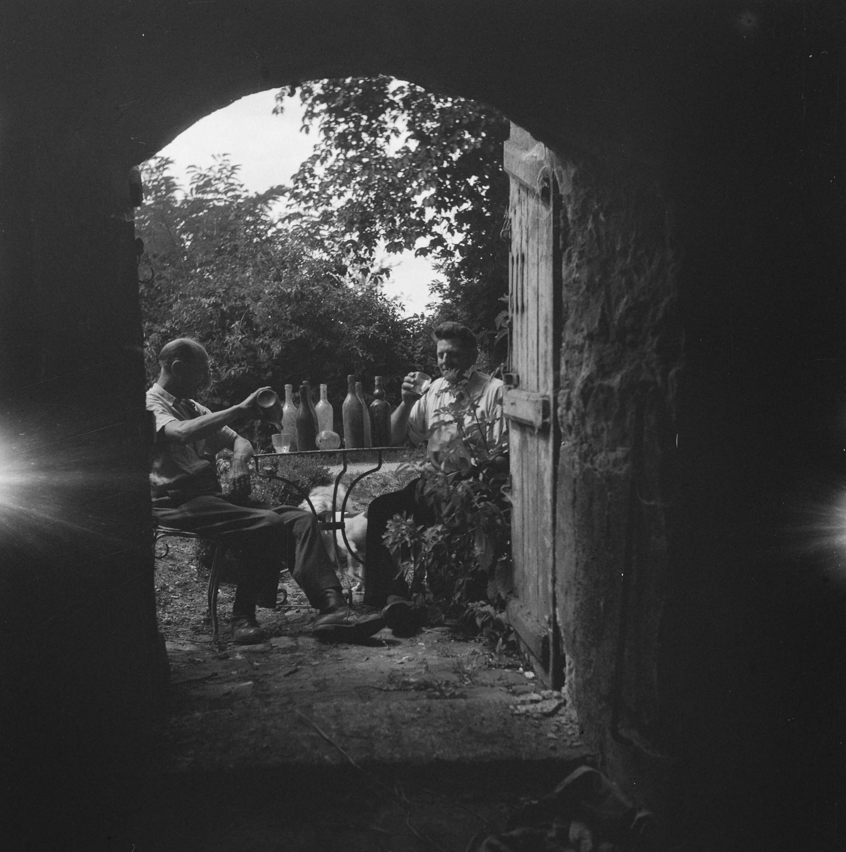 Doorkijkje. Twee mannen zitten aan een tafeltje, met allerlei stoffige flessen (wijn?)