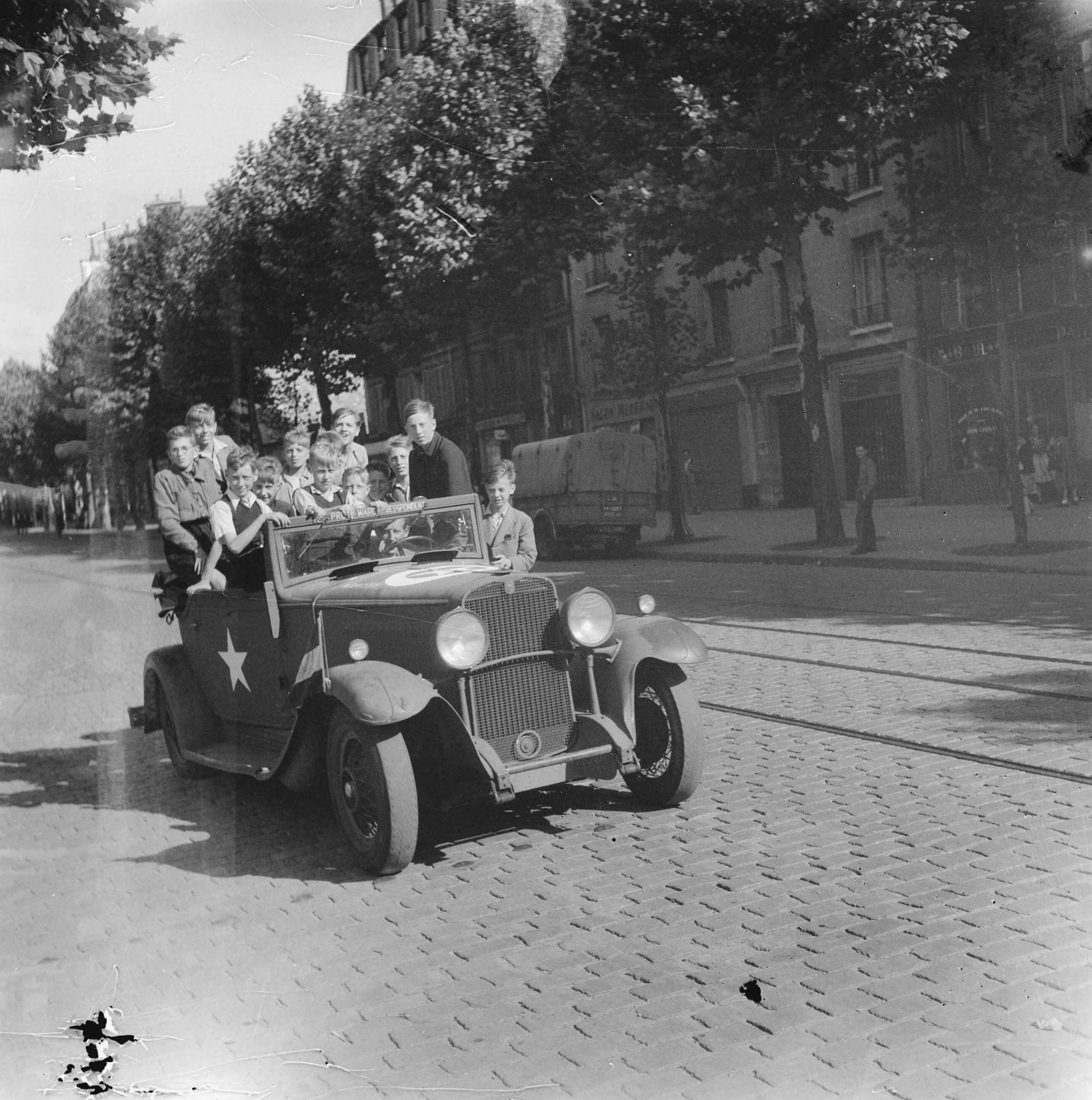 subserie: jongens in Parijs Groep jongens poseren in de auto van de Nederlandse oorlogscorrespondent