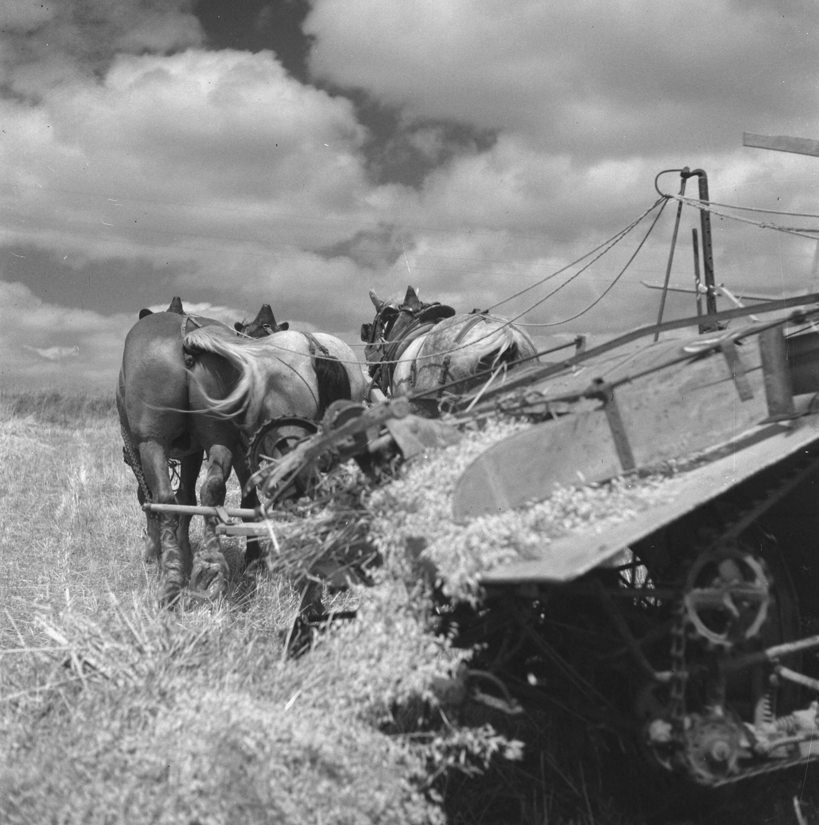 Oogsten met een dorsmachine getrokken door een driespan paarden