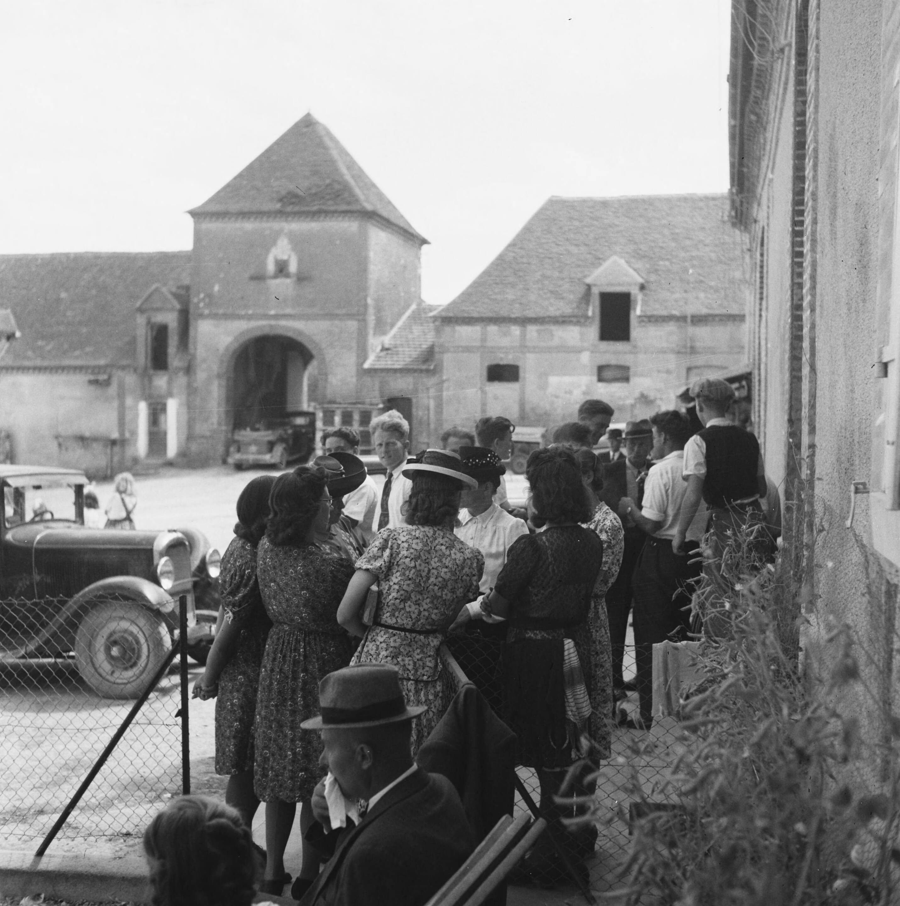 Een groot aantal personen staat op de binnenplaats van de boerenhoeve voor een gebouw. De meeste gekleed in zondagse kleding