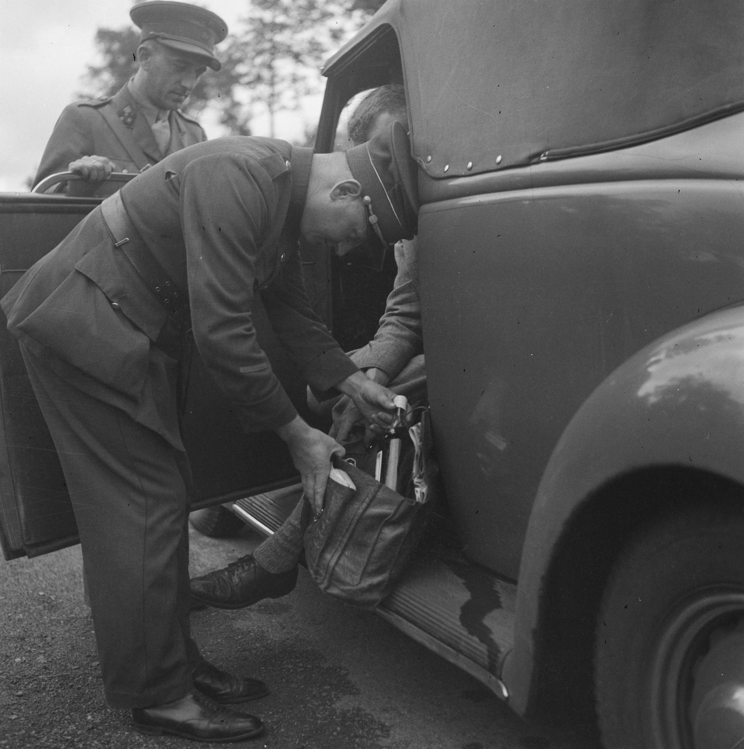 Een Belgische douanier controleert de inhoud van een tas van een bestuurder van een automobiel