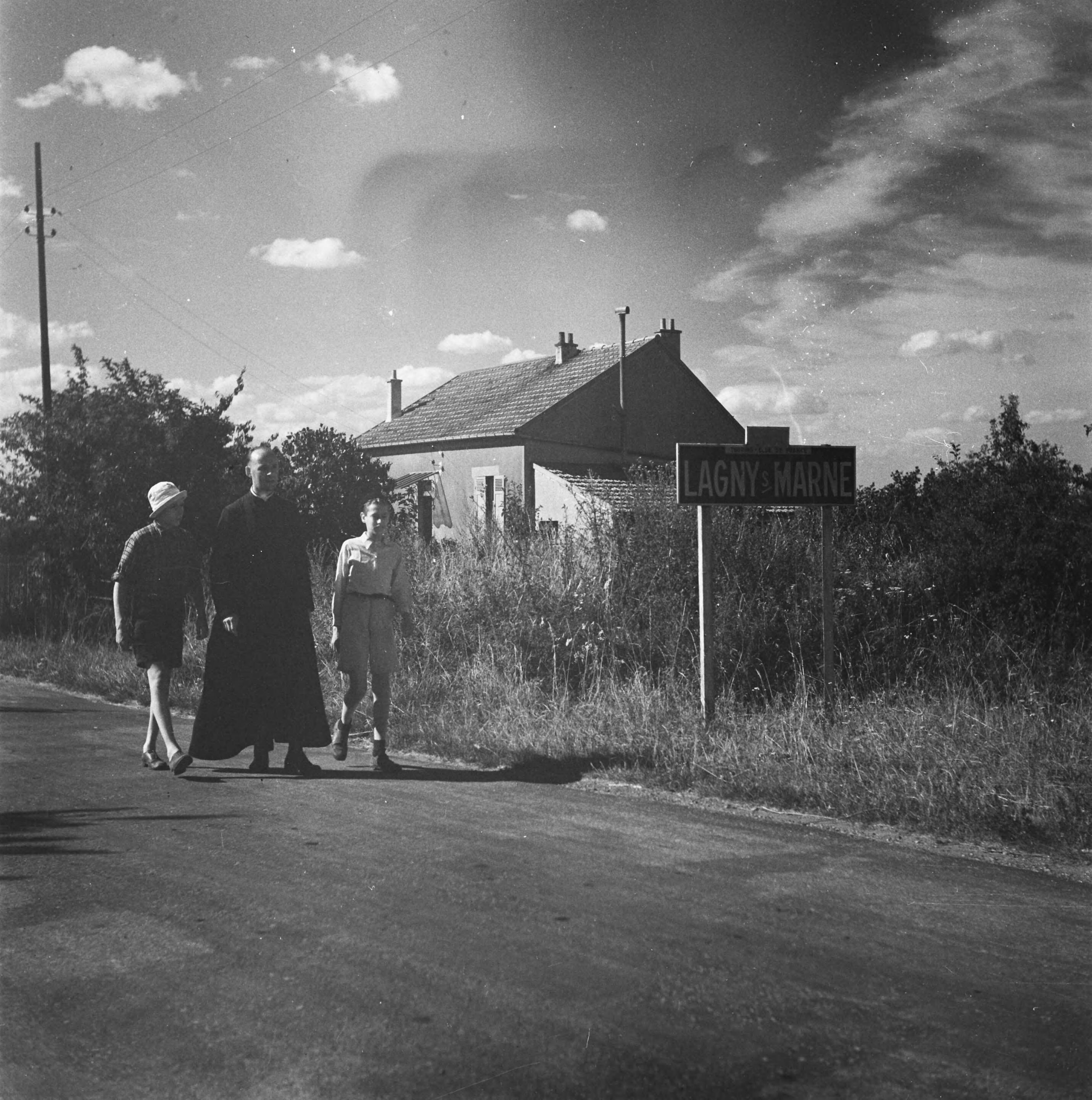 Een priester loopt met twee jongens op een weg. Rechts een plaatsnaambord "Lagny-sur-Marne"