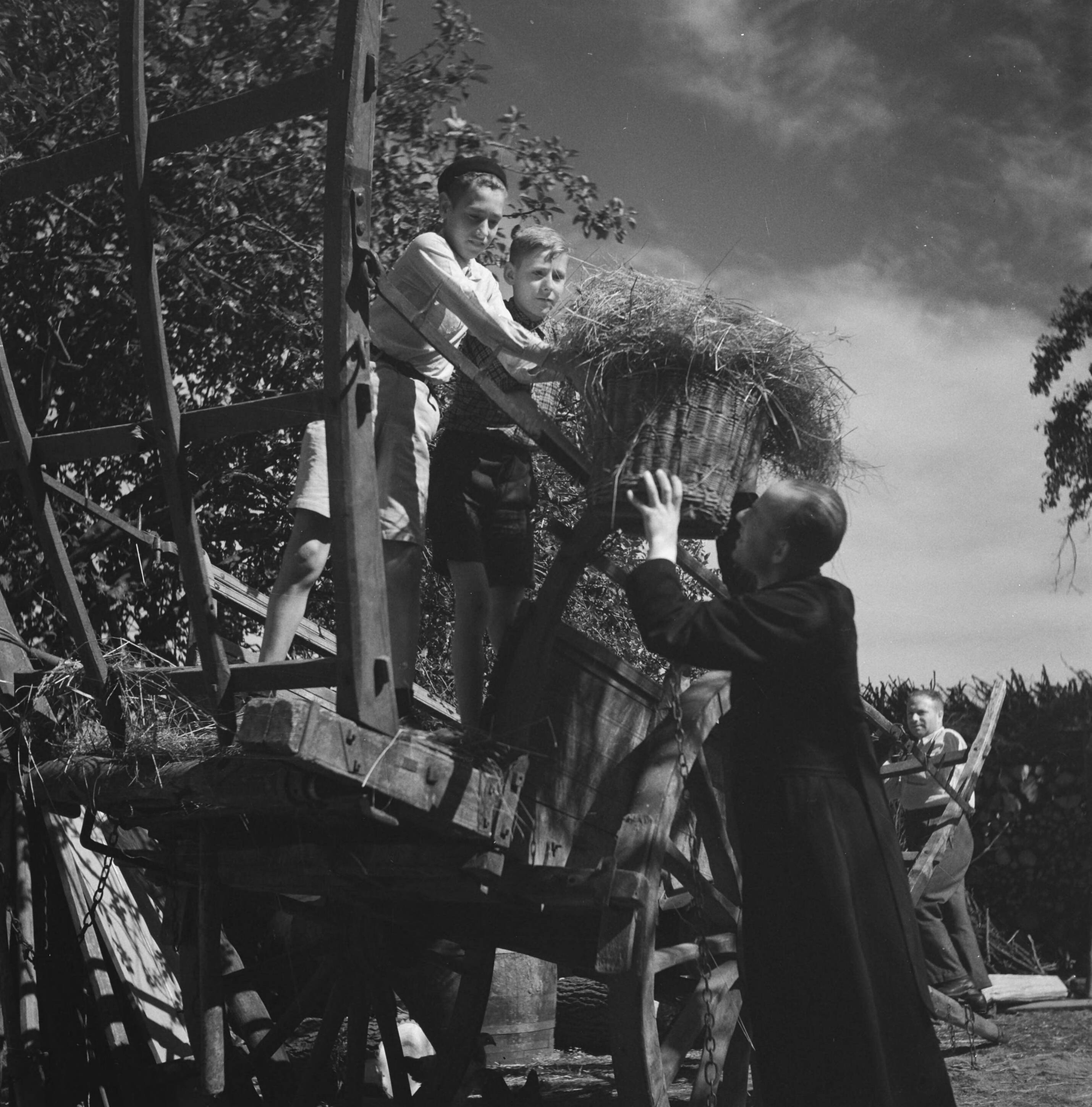Twee jongens staan op een boerenkar. Een priester reikt een mand met hooi? aan