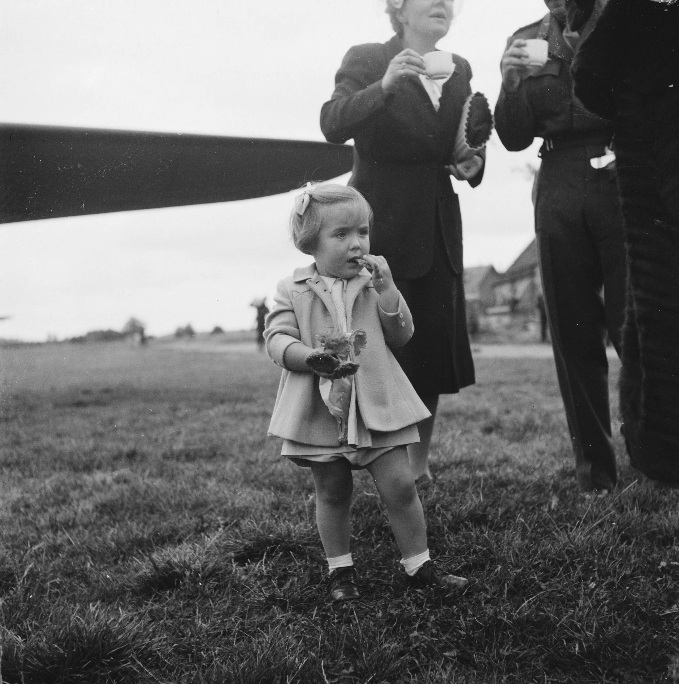 Prinses Margriet knabbelt aan een koekje, terwijl prinses Juliana en prins Bernhard een kop thee drinken