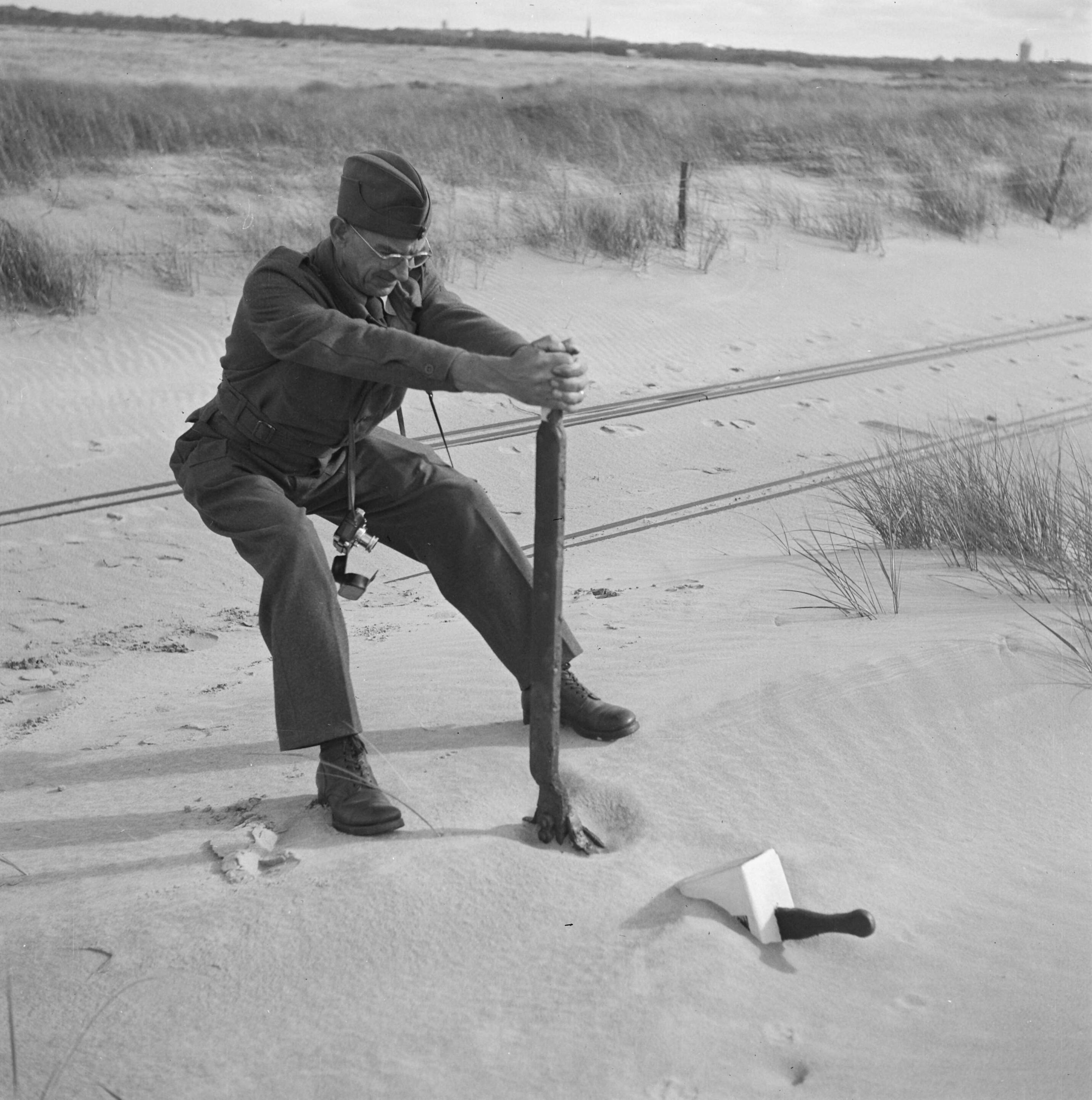 Man in uniform (met fotocamera om de hals) probeert aan de handel van een spoorwissel te trekken