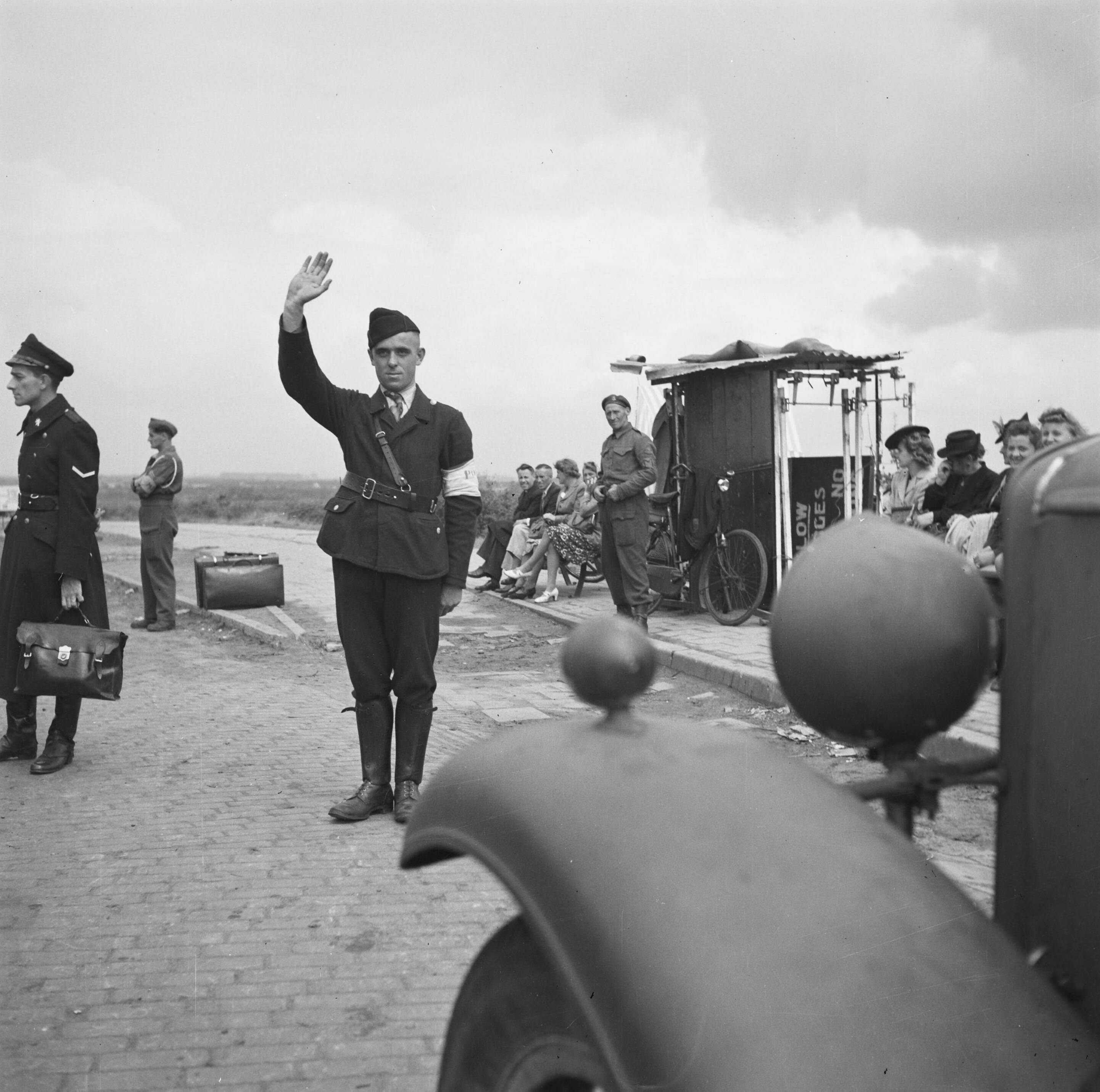 Een man in uniform met armband steekt zijn hand omhoog. Hij staat bij een halteplaats waar militairen en burgers staan en zitten