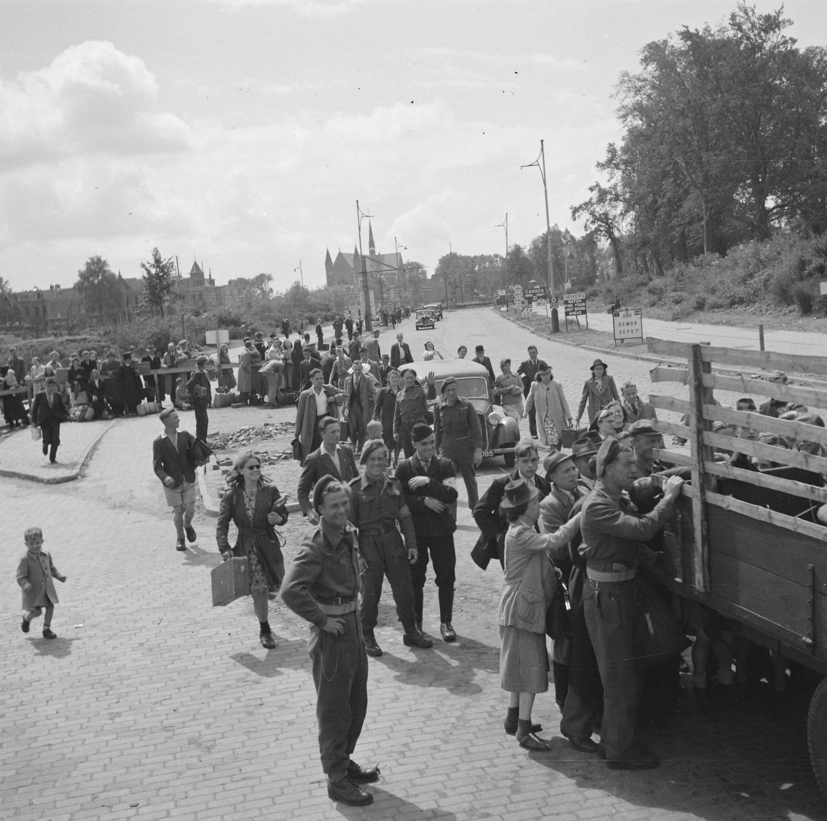 Aan de rand van de stad bestormen burgers een vrachtwagen bij een uitvalsweg. Rechts verkeersborden en aanwijzingen van het Canadese leger