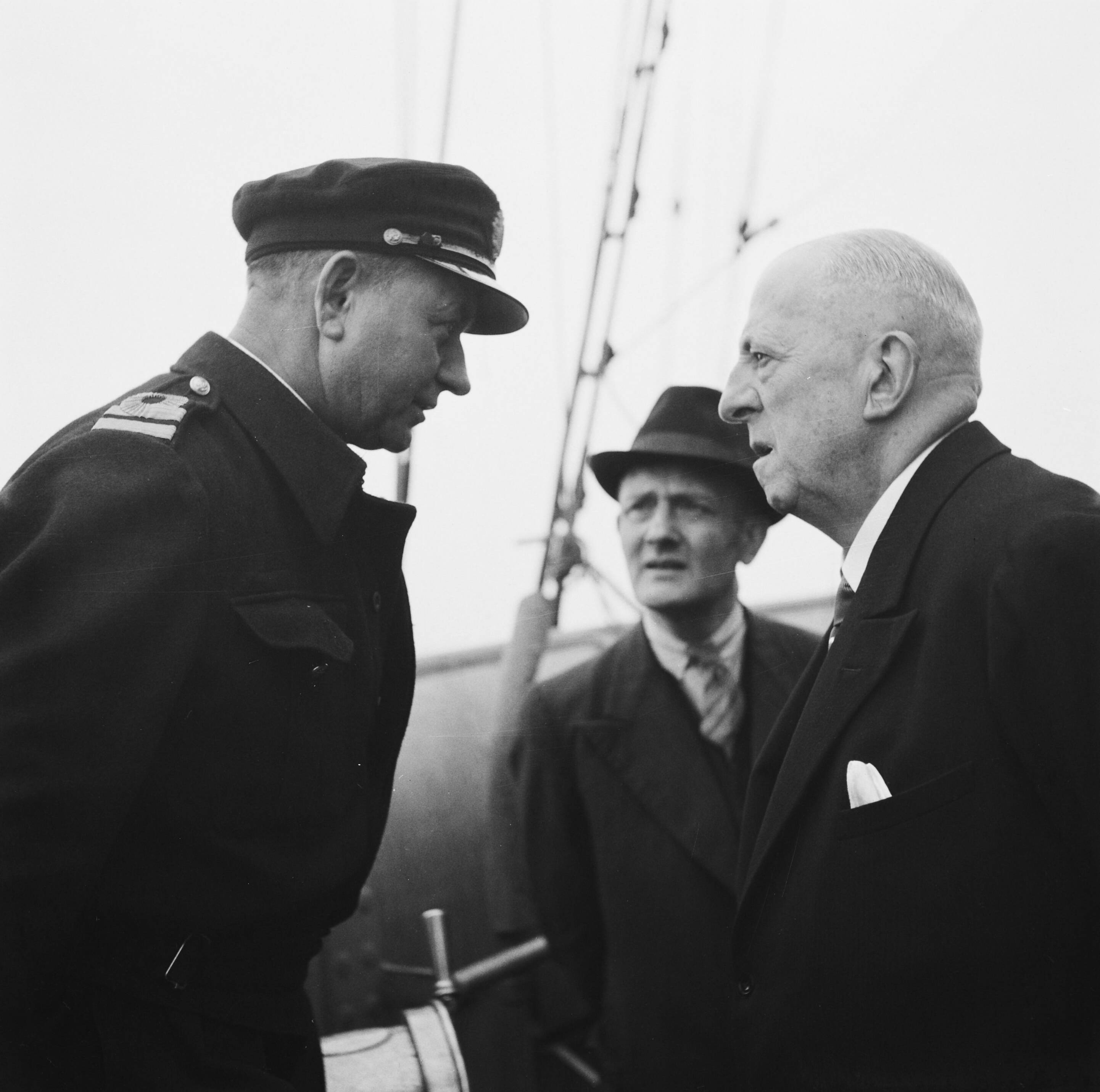 Thuiskomst van de sleepboot "Amsterdam" Kapitein Maarten de Koe in gesprek met directeur van rederij Jan Goedkoop jr.