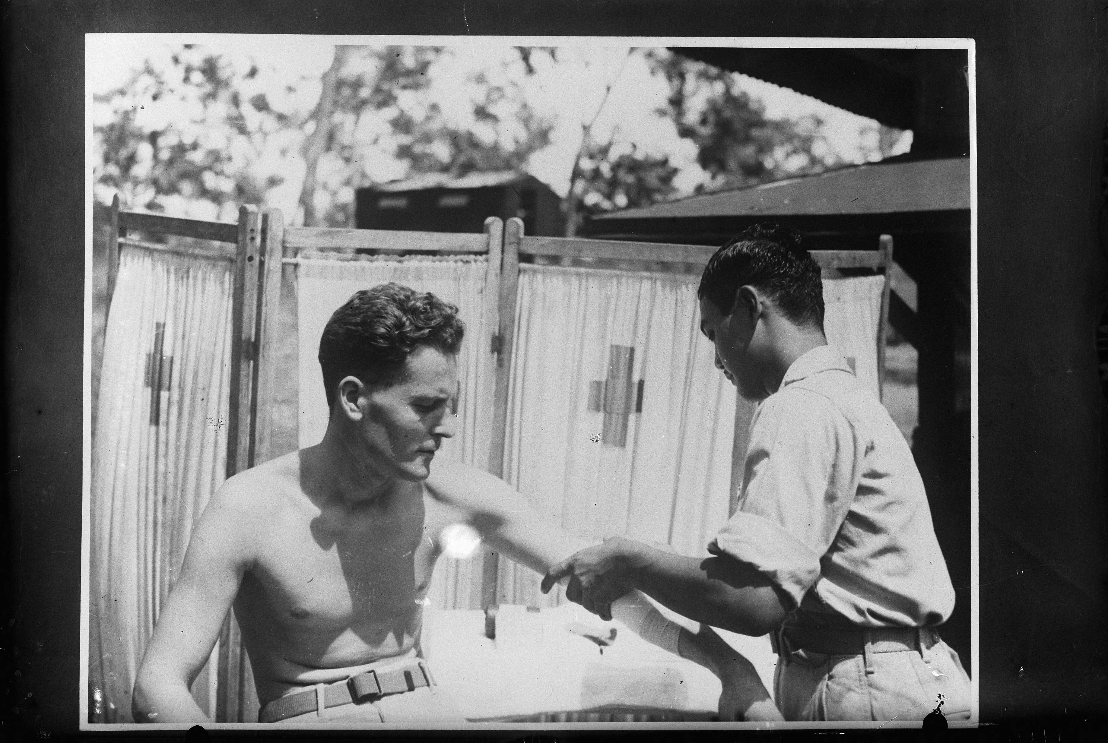 Lid van het 18e bommenwerpeskader die zijn gewonde arm laat verbinden