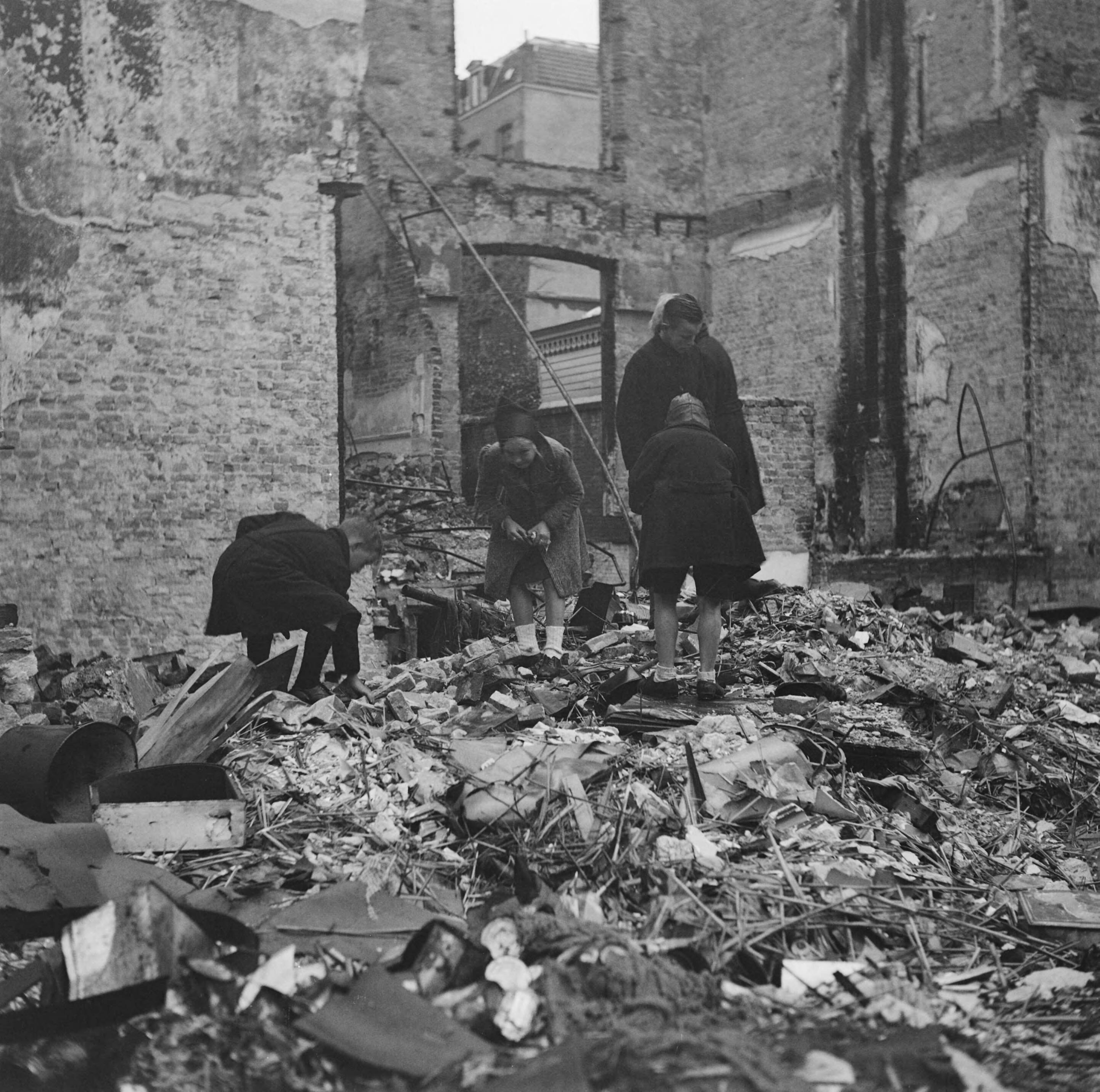 Kinderen zoek tussen het puin naar hout of voorwerpen