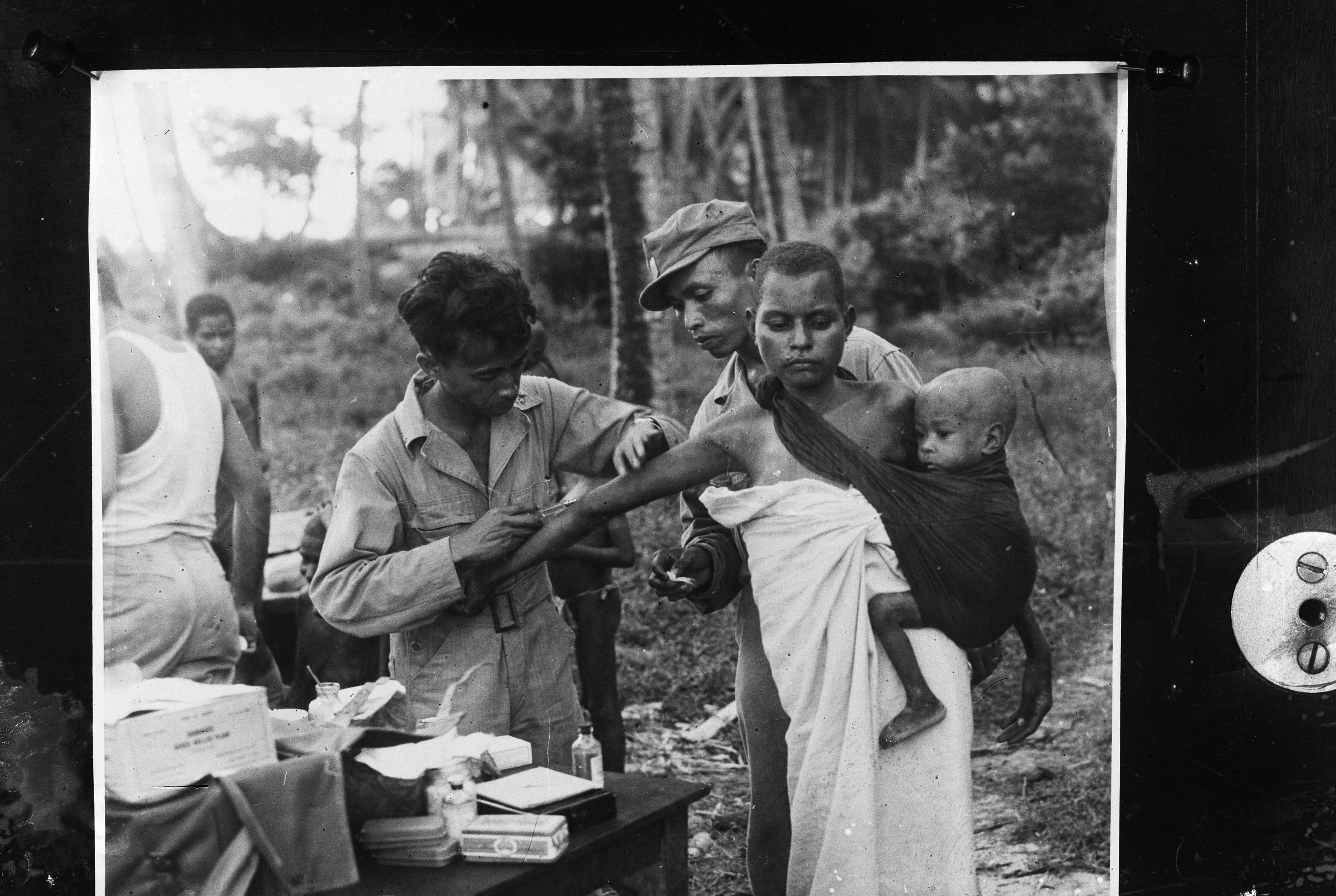 Direct na de landing der eerste troepen in Nederlands-Indië werden medische afdelingen van de NICA (Netherlands Indies Civil Administration) aan land gezet om de gevangene en Indonesiër de eerste hulp te verlenen Leden van de medische afdeling van het NICA geven de Indonesiërs injecties tegen besmettelijke ziekten