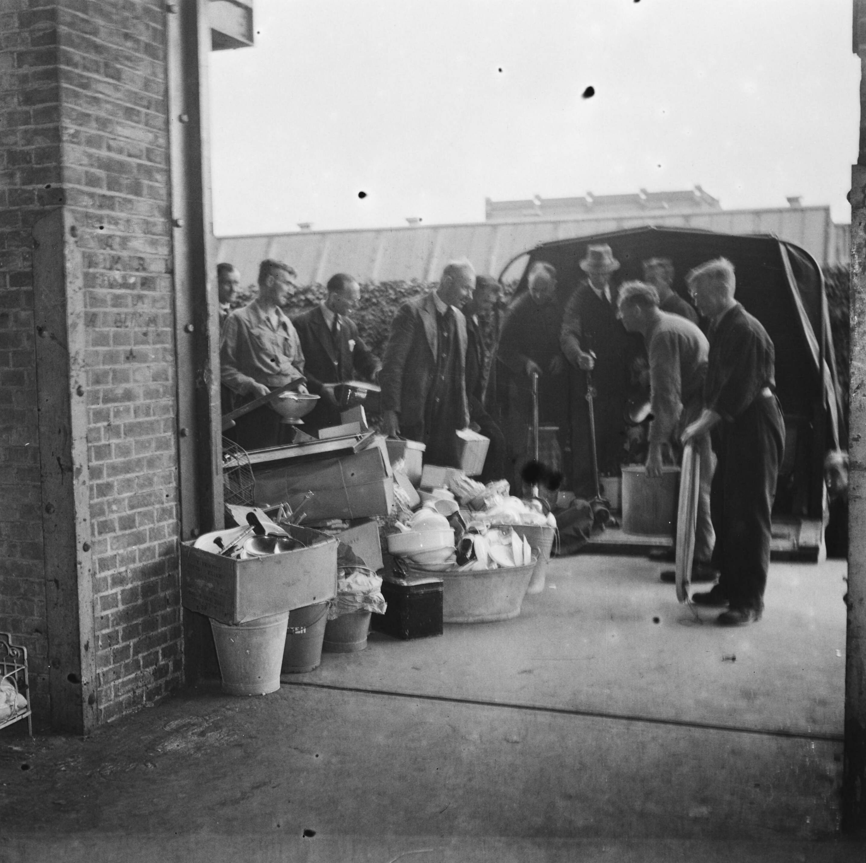 Boten met bestemming Arnhem worden met gebruiksgoederen geladen aan de Cruquiusweg te Amsterdam