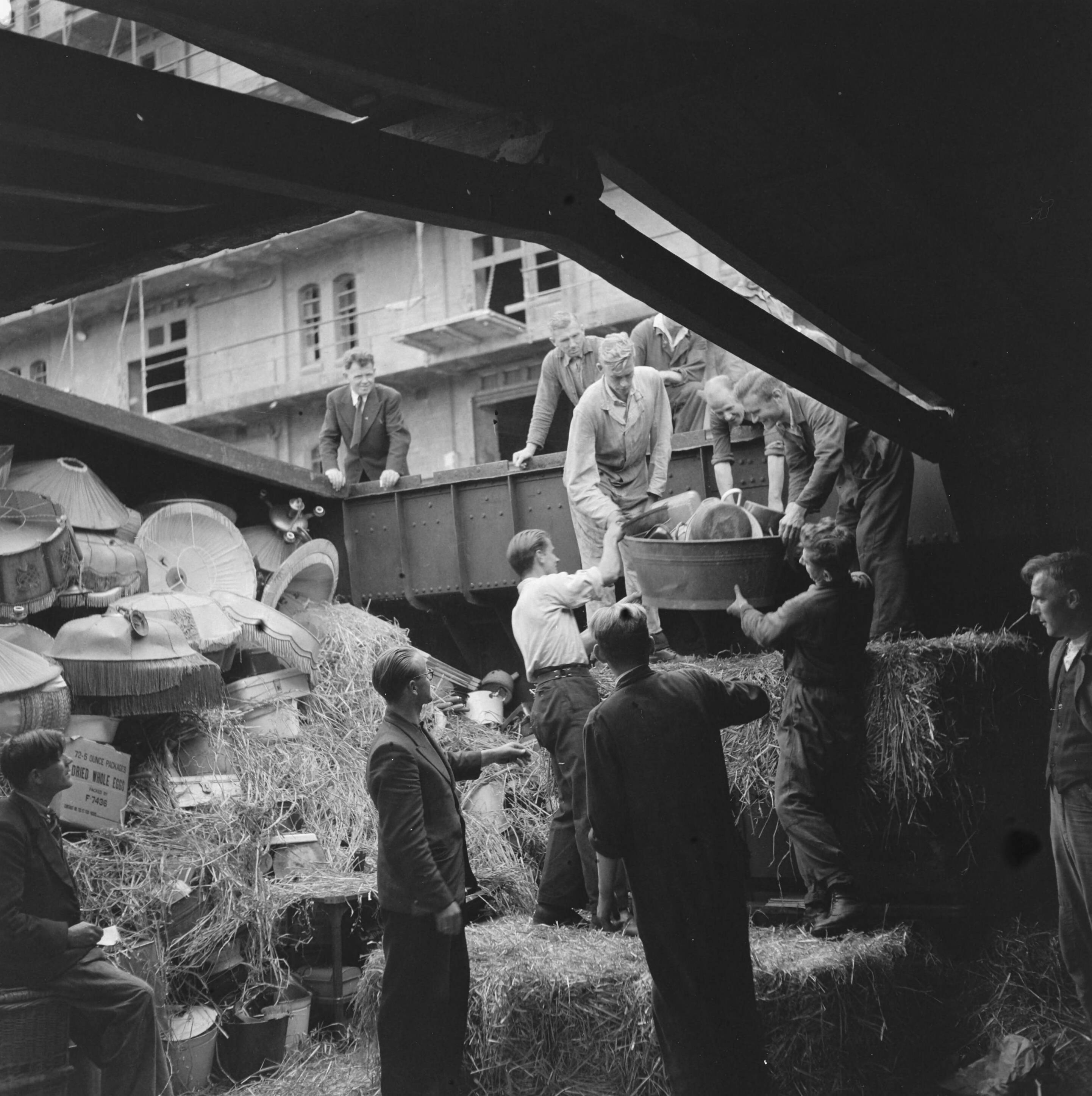 Boten met bestemming Arnhem worden met gebruiksgoederen geladen aan de Cruquiusweg te Amsterdam