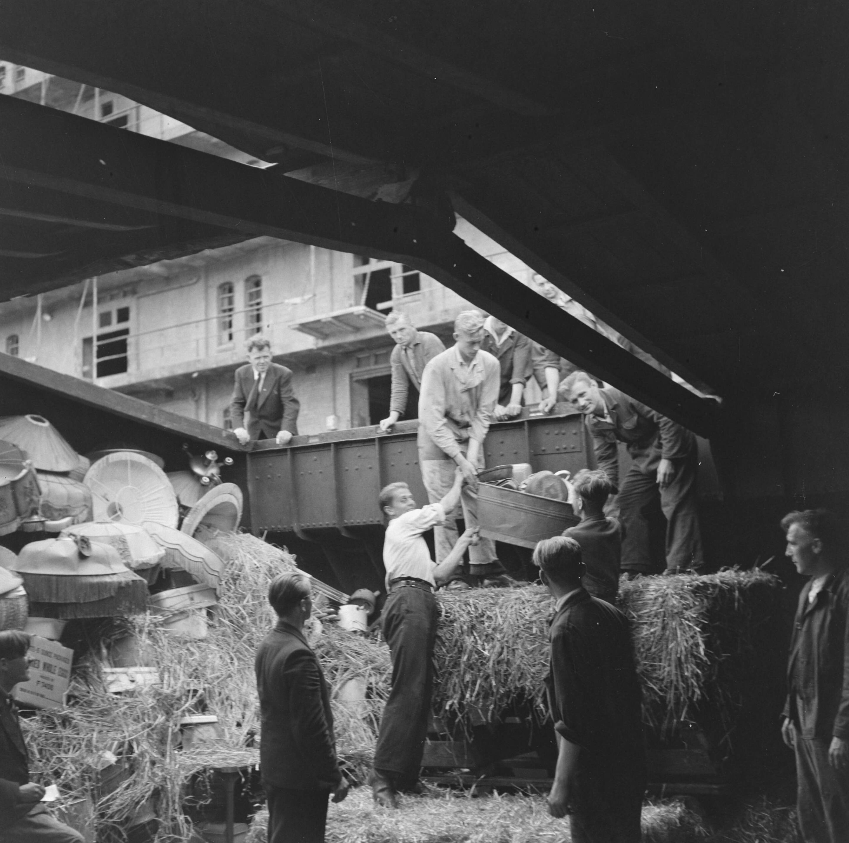 Boten met bestemming Arnhem worden met gebruiksgoederen geladen aan de Cruquiusweg te Amsterdam