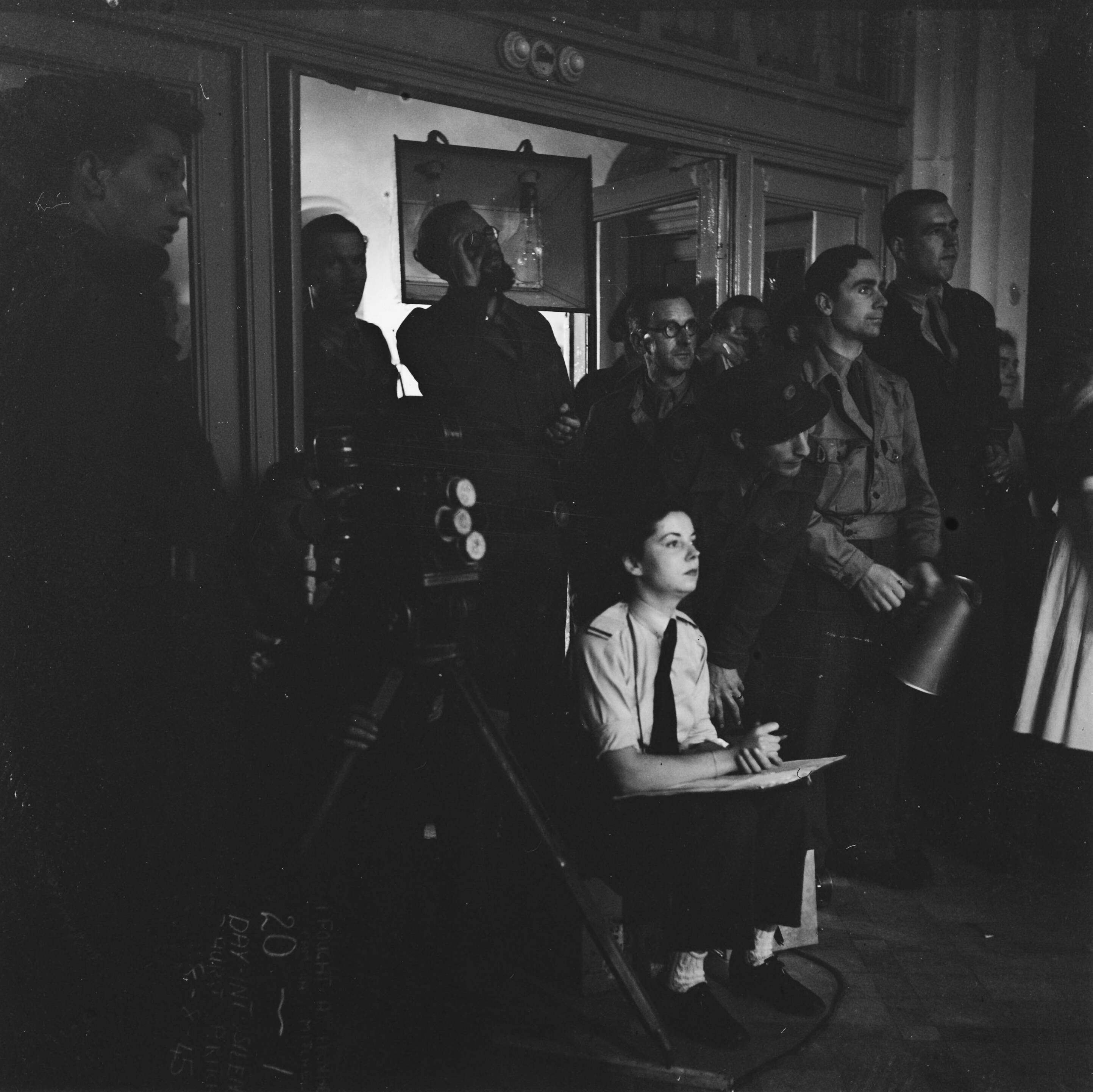 Scriptgirl en filmcrew bij binnenopname