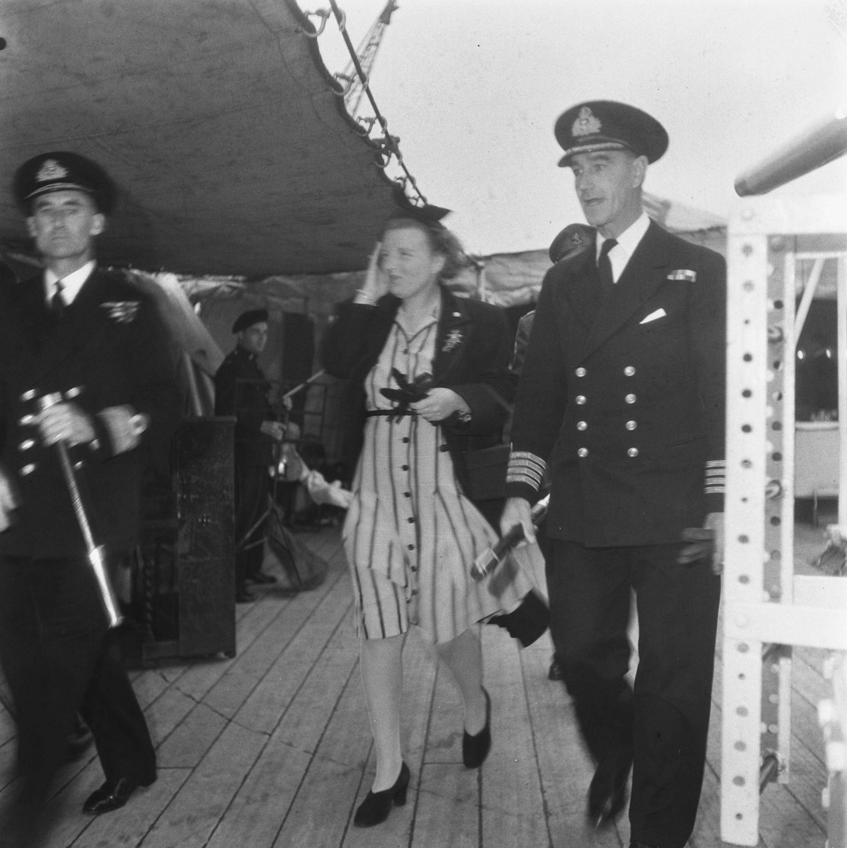 Prinses Juliana aan boord van de lichte kruiser HMS Bellona