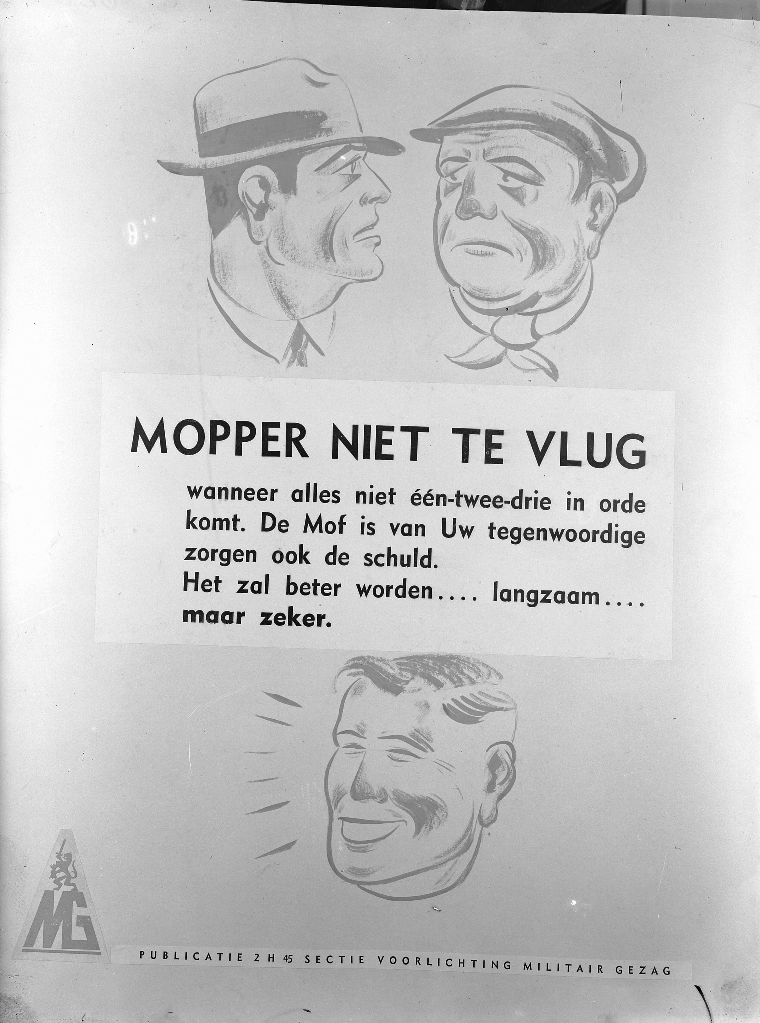 Reprodukties van de RVD, affiches sectie Voorlichting Militair Gezag "Mopper niet te vlug"