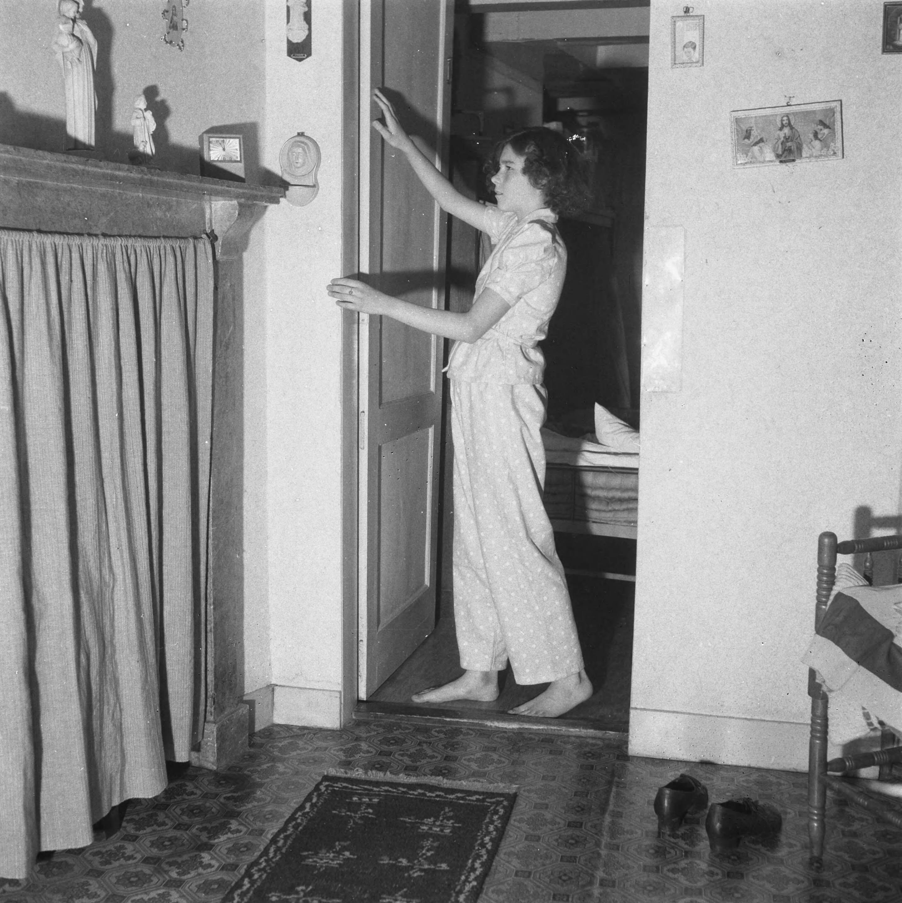Een meisje in pyama staat in de deuropening van een slaapkamer