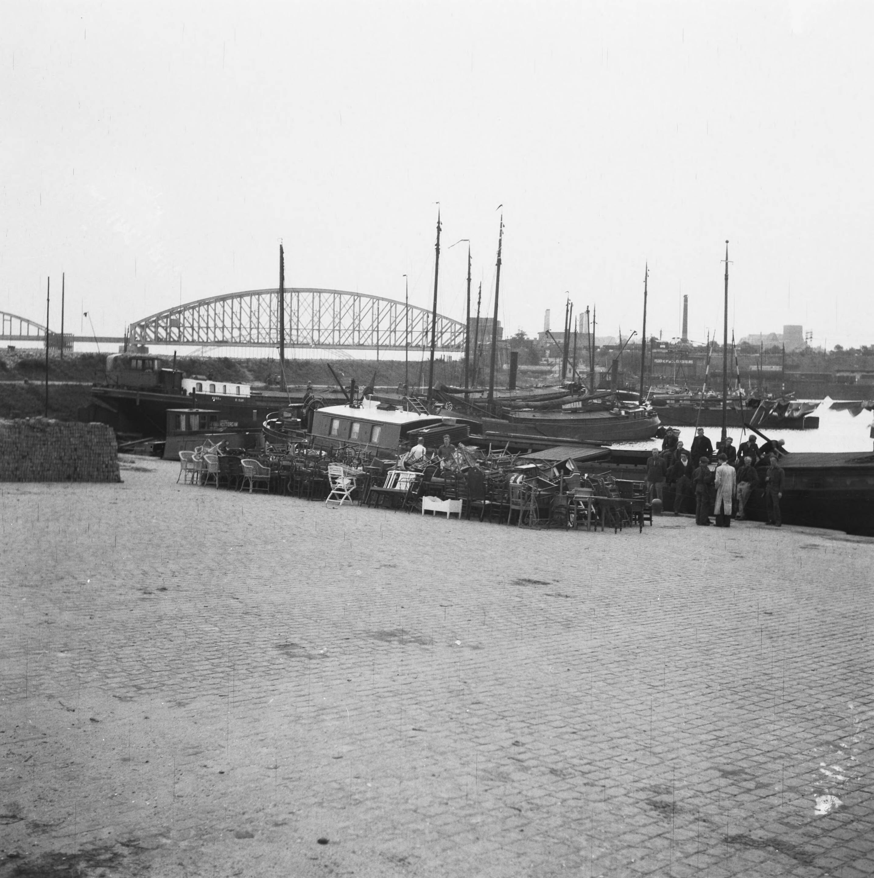 Huisraad en meubilair op de kade van een binnenhaven In de verte een brug