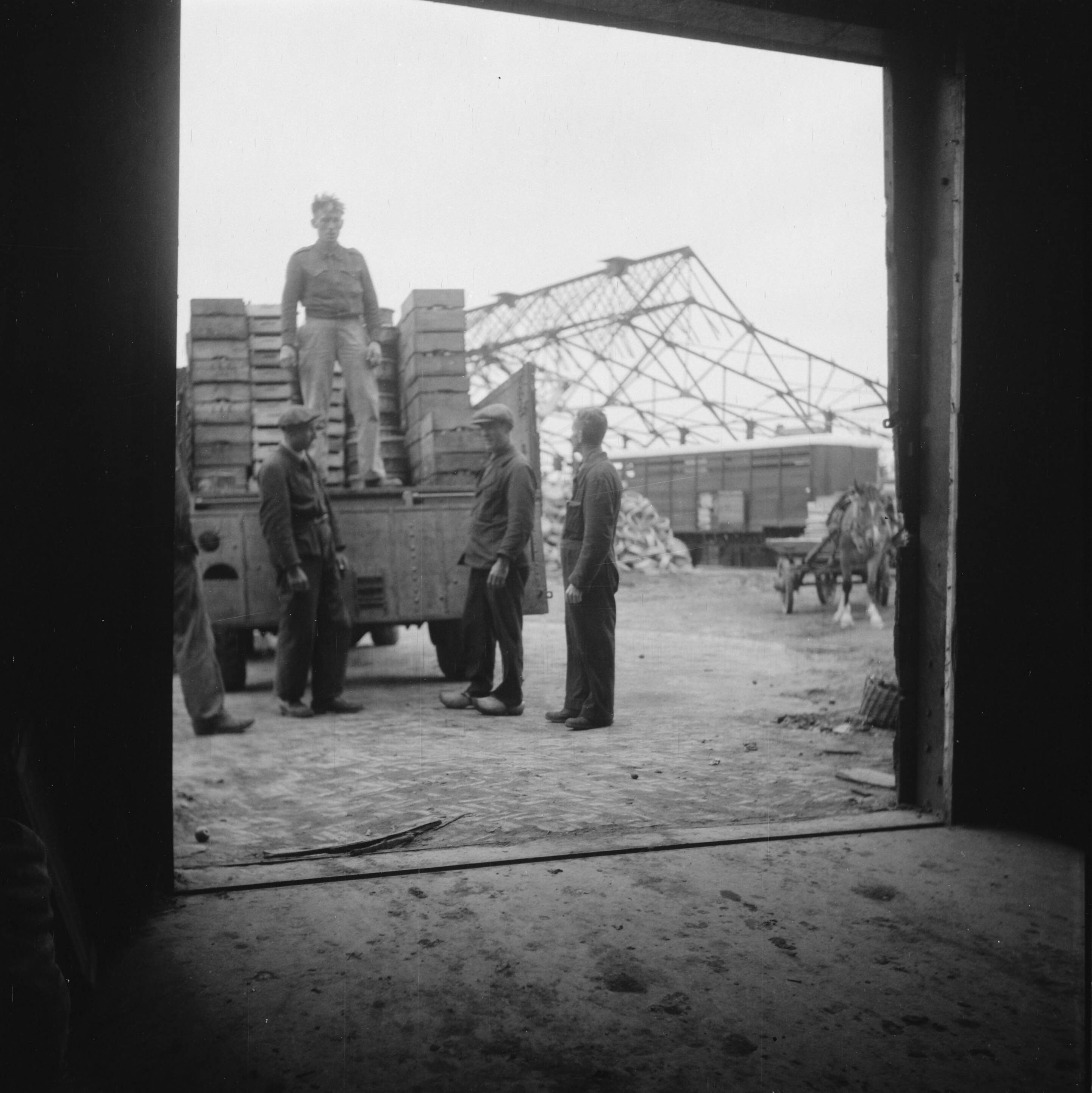 Een vrachtwagen geladen met groentekisten staat voor een totaal verwoeste loods