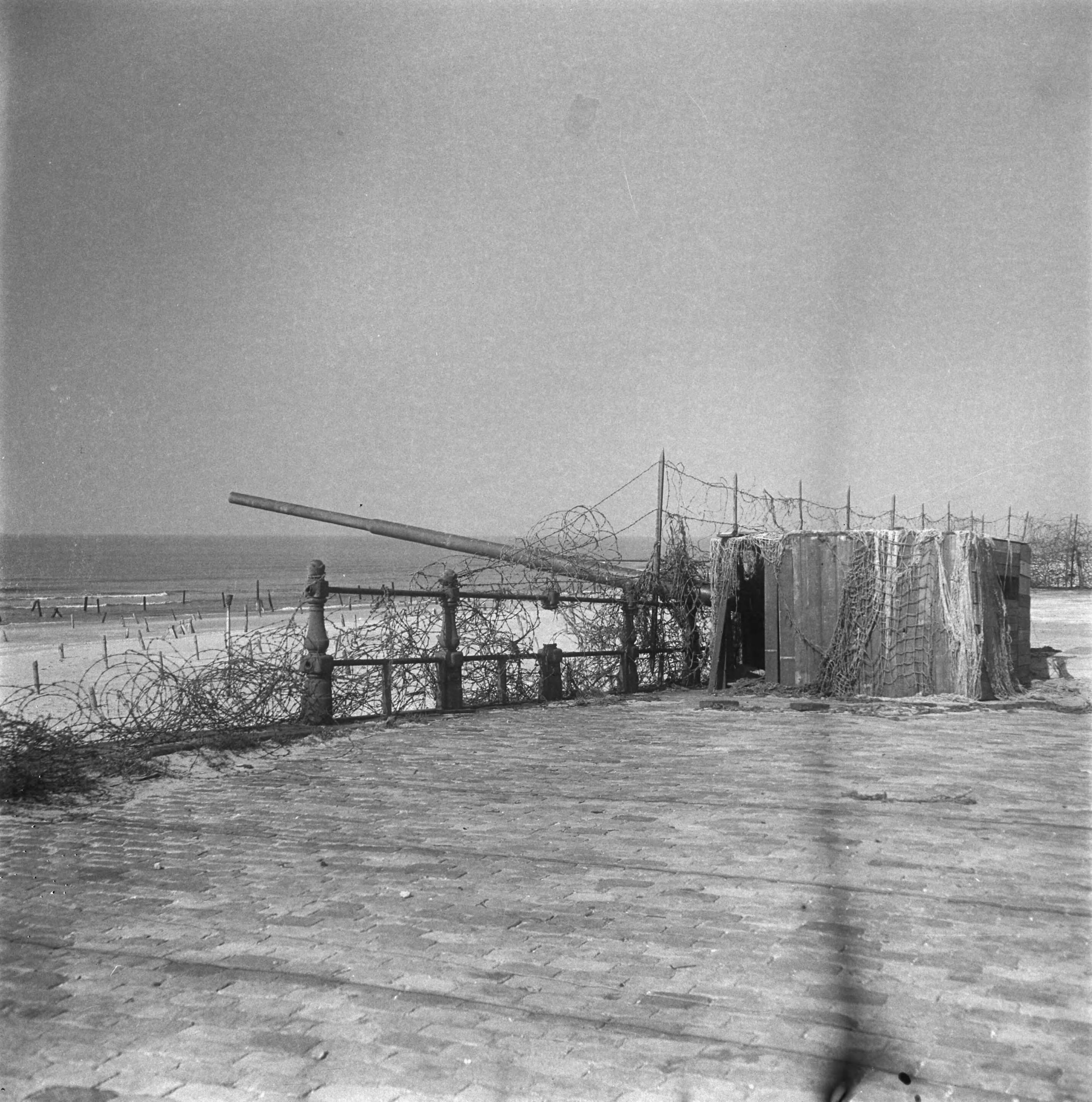 Scheveningen, overzicht van de strand en boulevardversperringen Atlantikwall