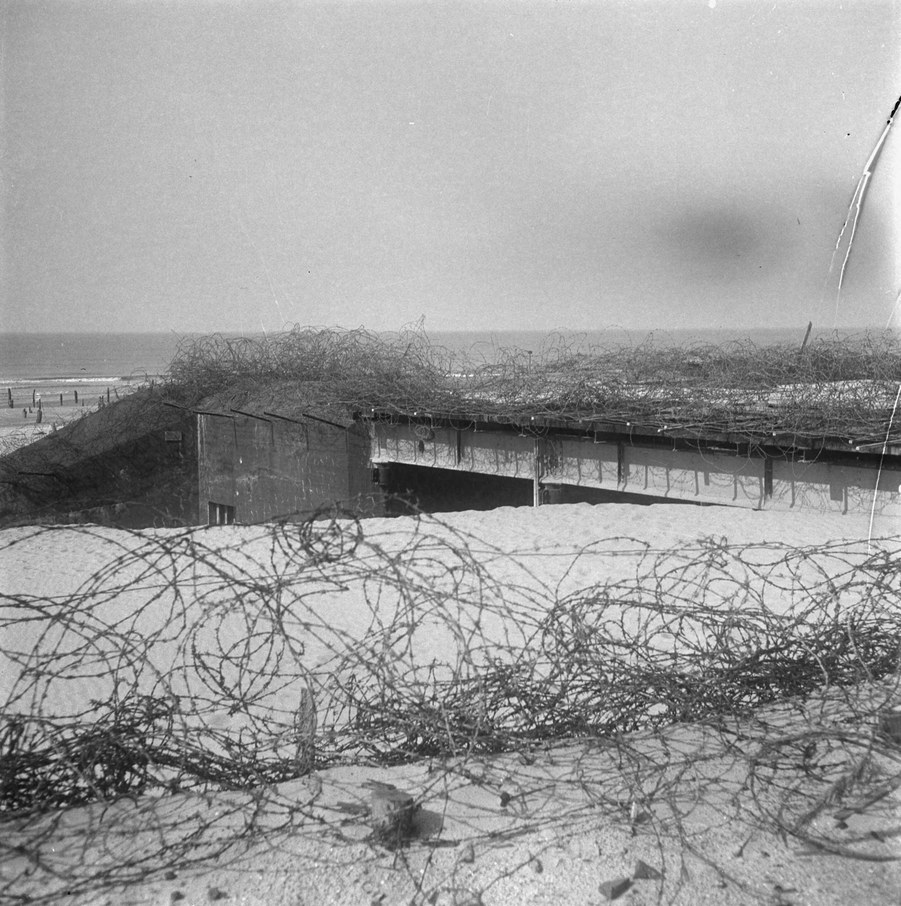 Scheveningen, overzicht van de strand en boulevardversperringen Atlantikwall. Restanten van de Scheveningse Pier