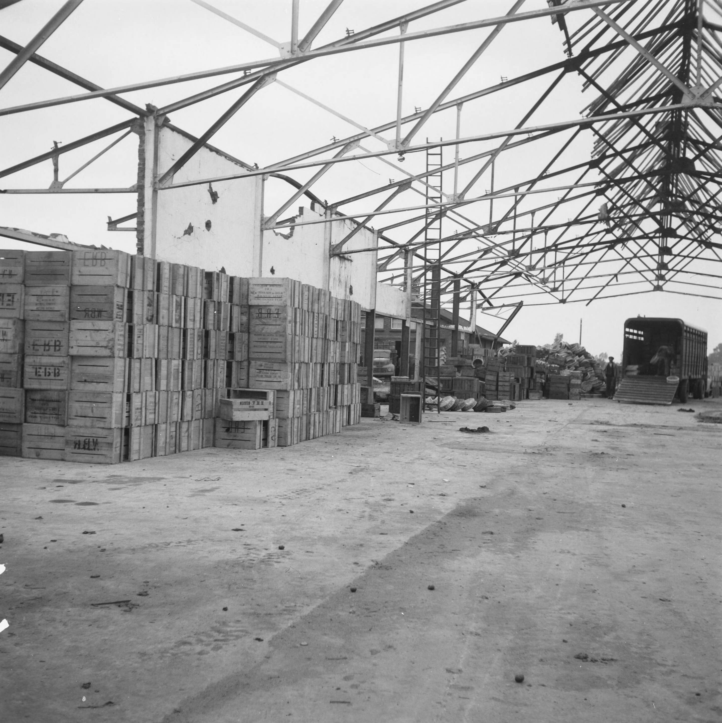 Loods zonder dak. Opgestapelde fruitkisten, rieten manden en een vrachtwagen