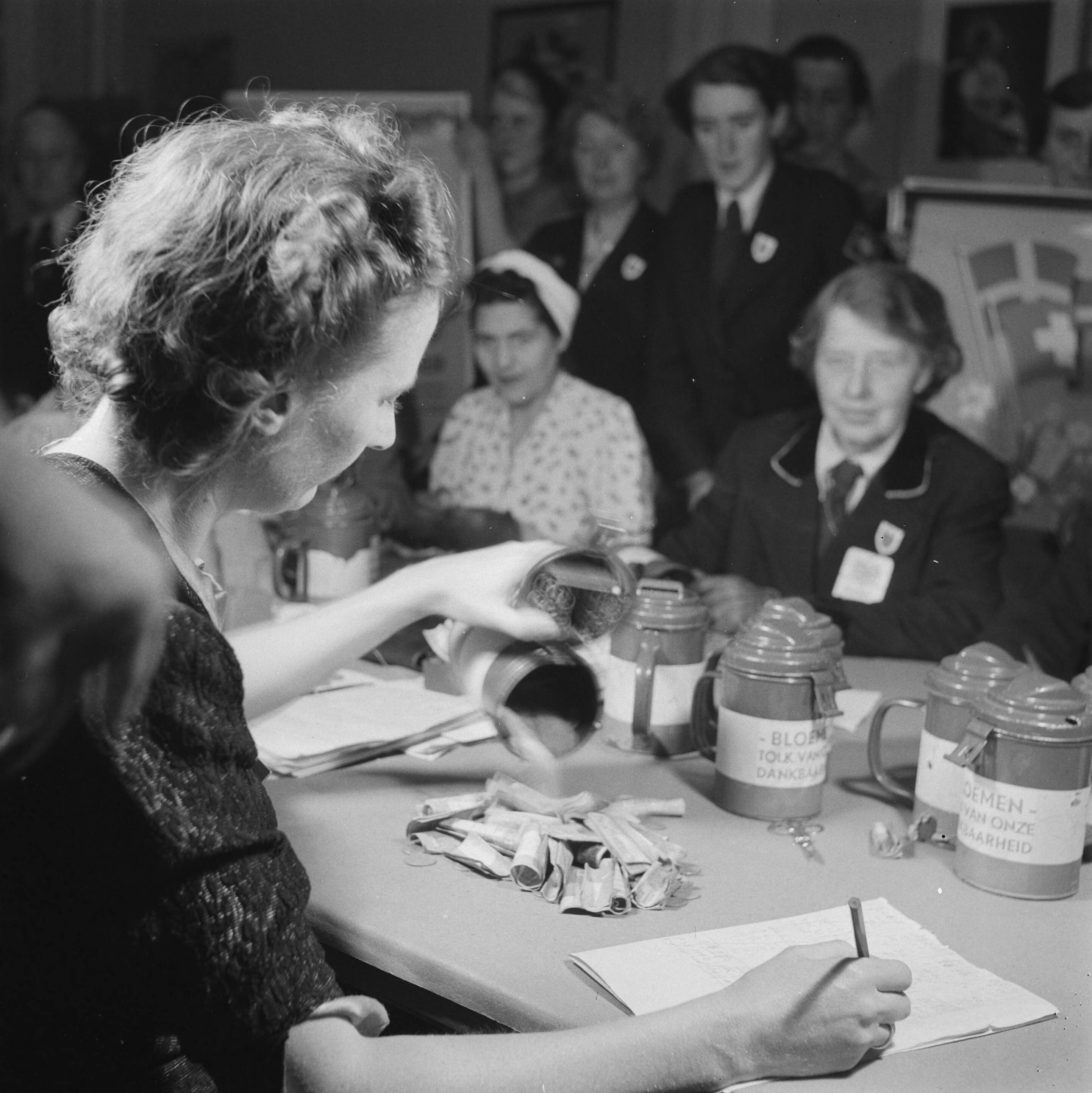 Collectebussen worden geleegd en de inhoud geteld door een aantal vrouwen rond een tafel