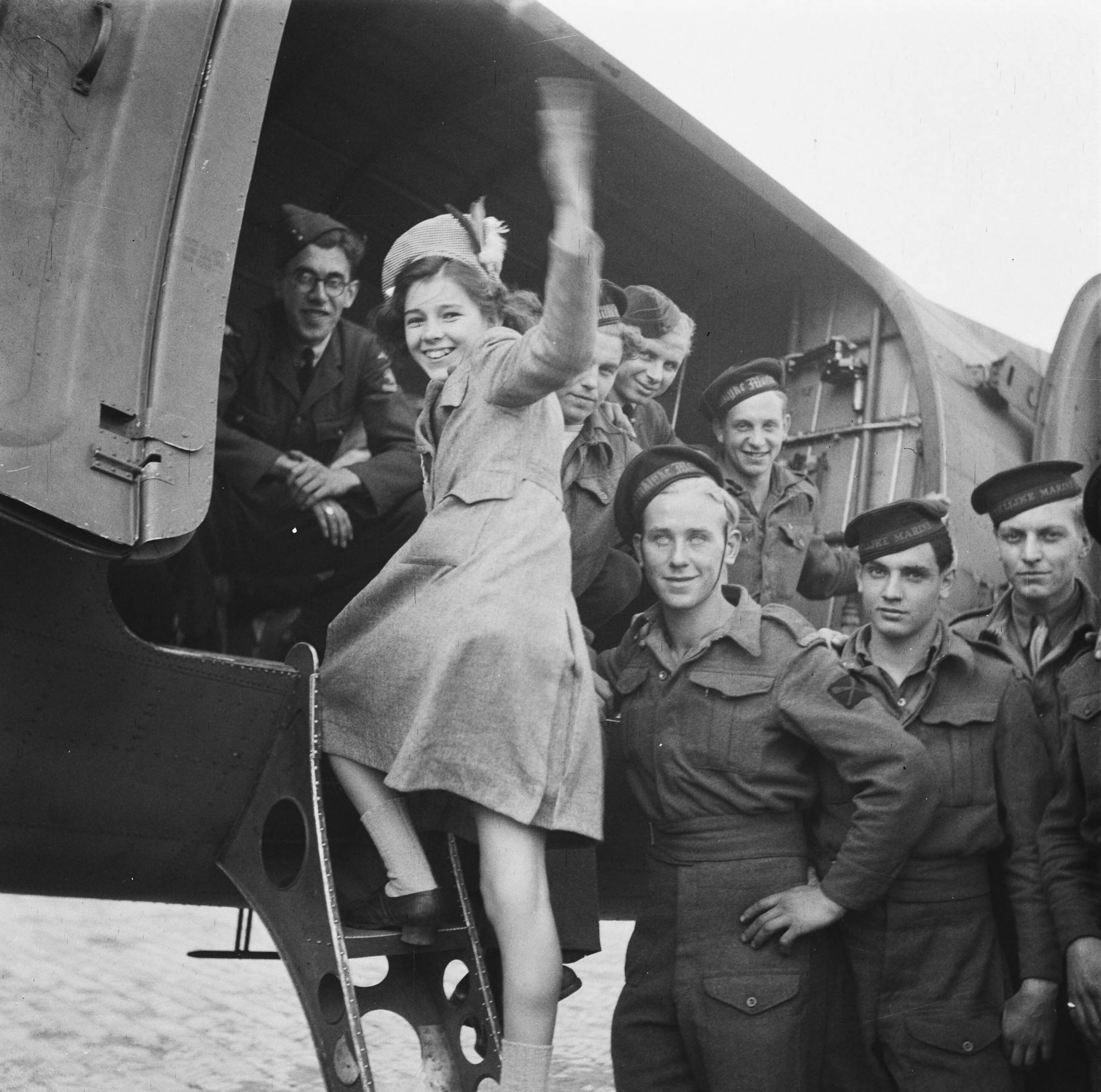 Meisje stapt in vliegtuig omgeven door soldaten en matrozen