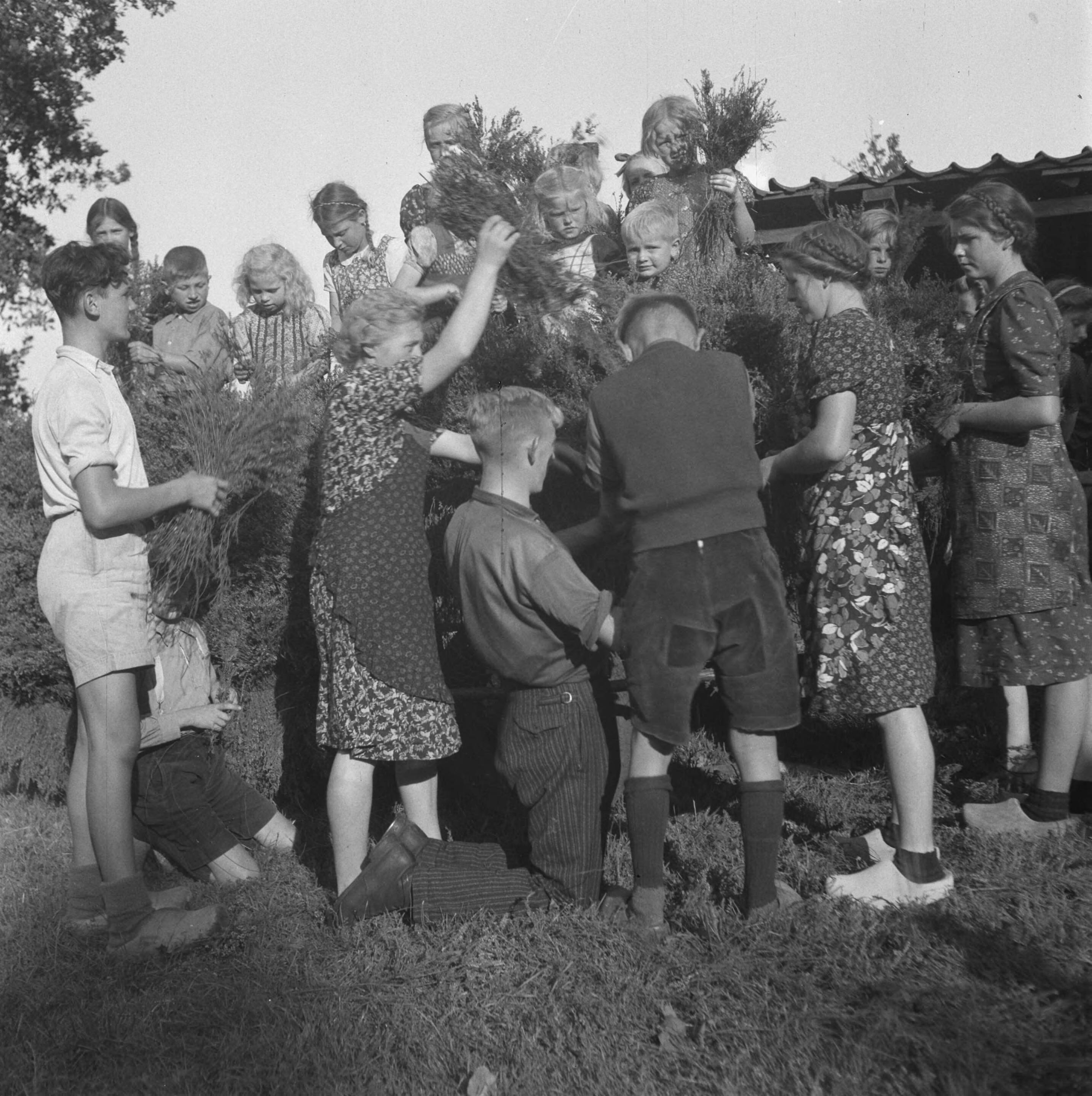 Kinderen en vrouwen bezig om iets te versieren met struikhei