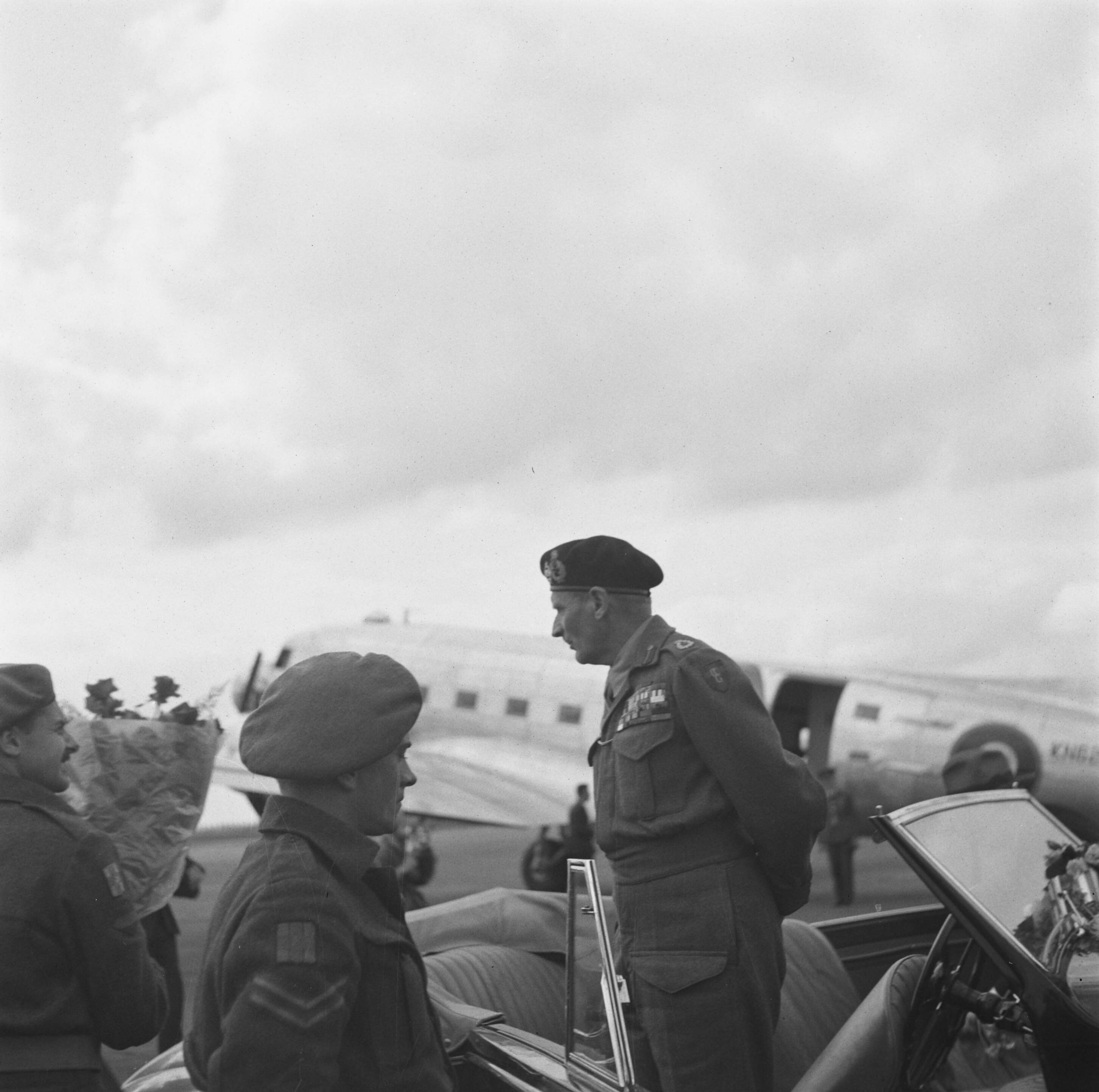 Montgomery staat in auto op het vliegveld. Krijgt boeket bloemen aangereikt