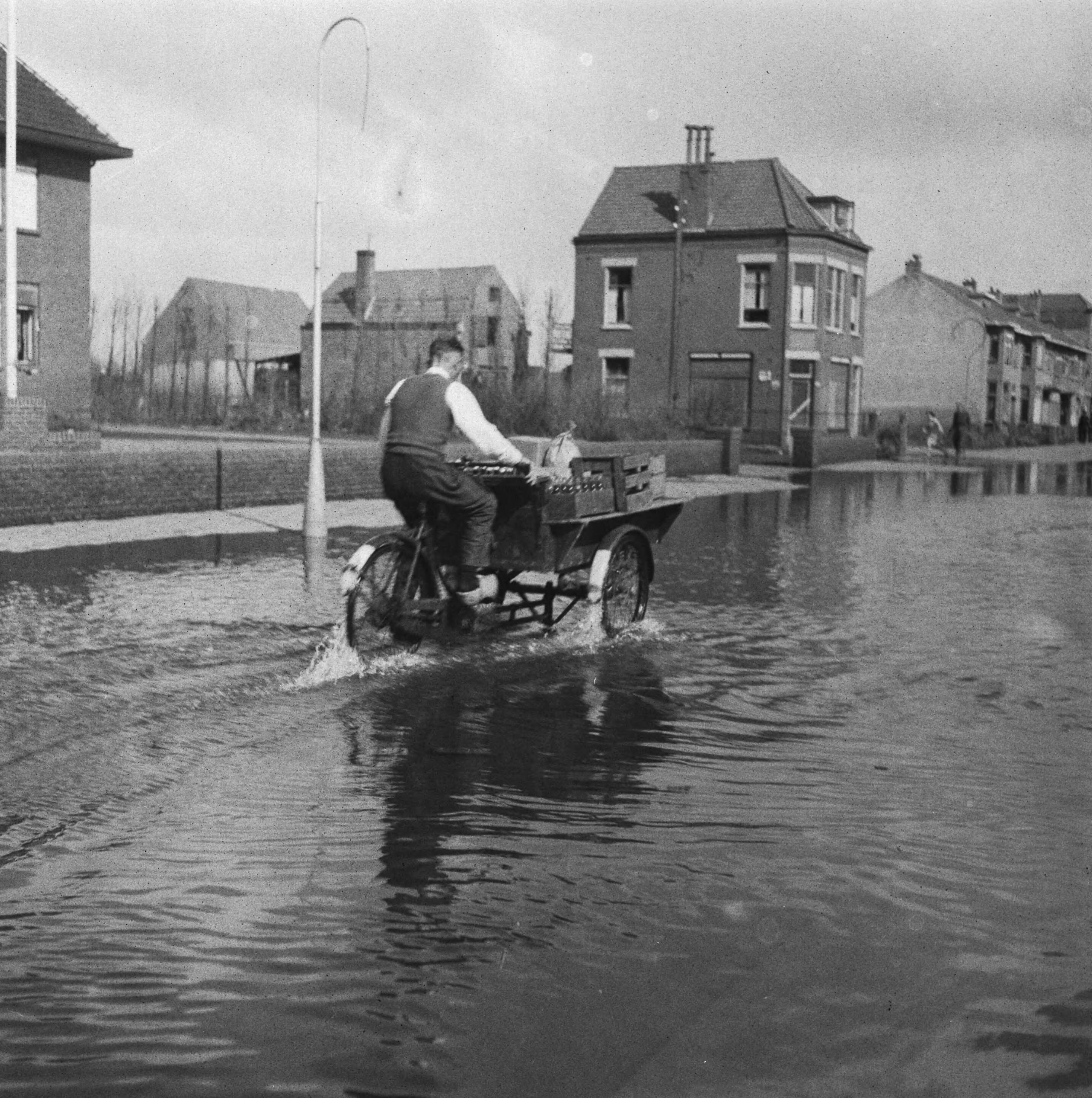 Man op bakfiets fietst door ondergelopen straat