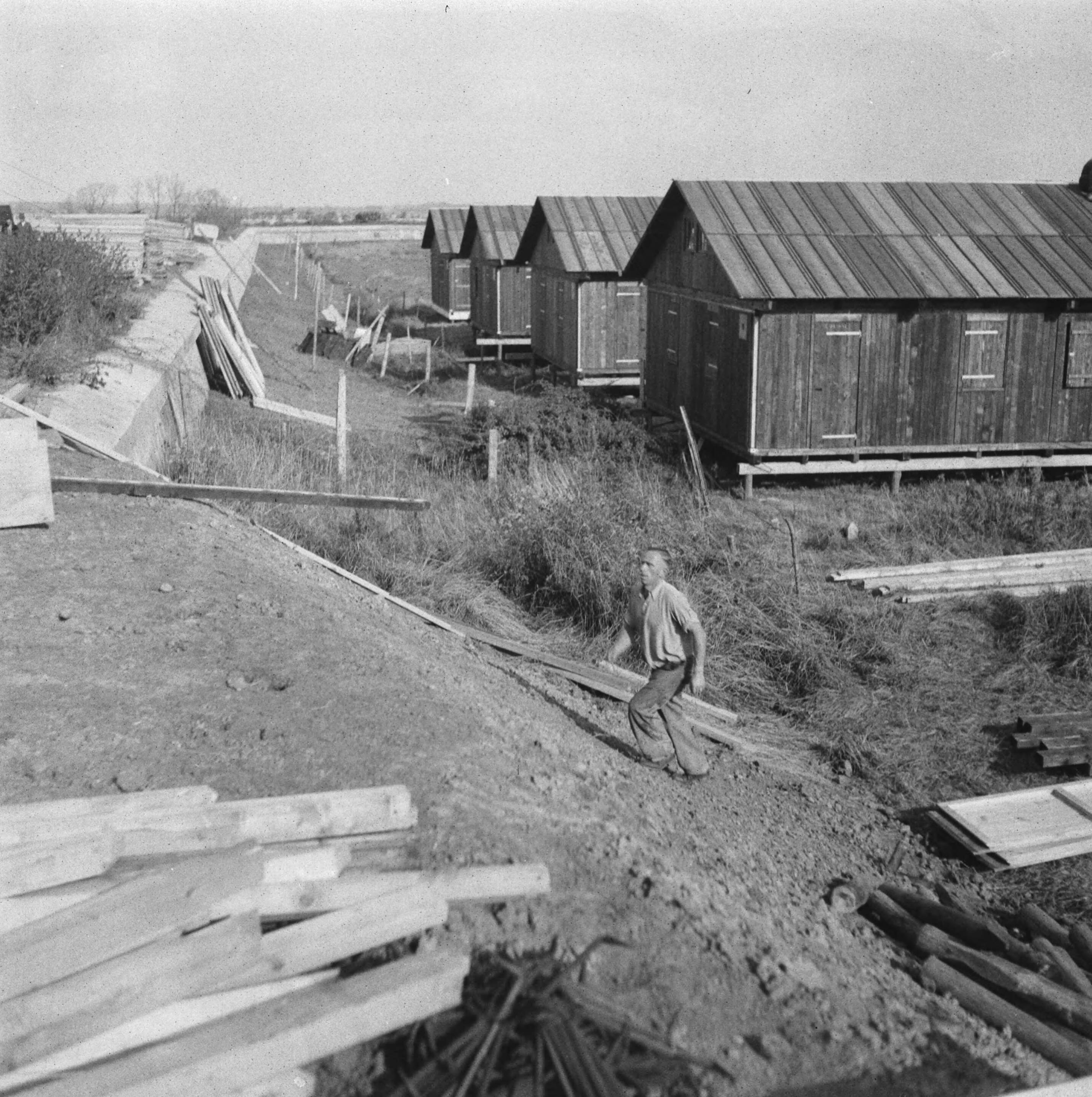 Barakken achter een versterkte dijk