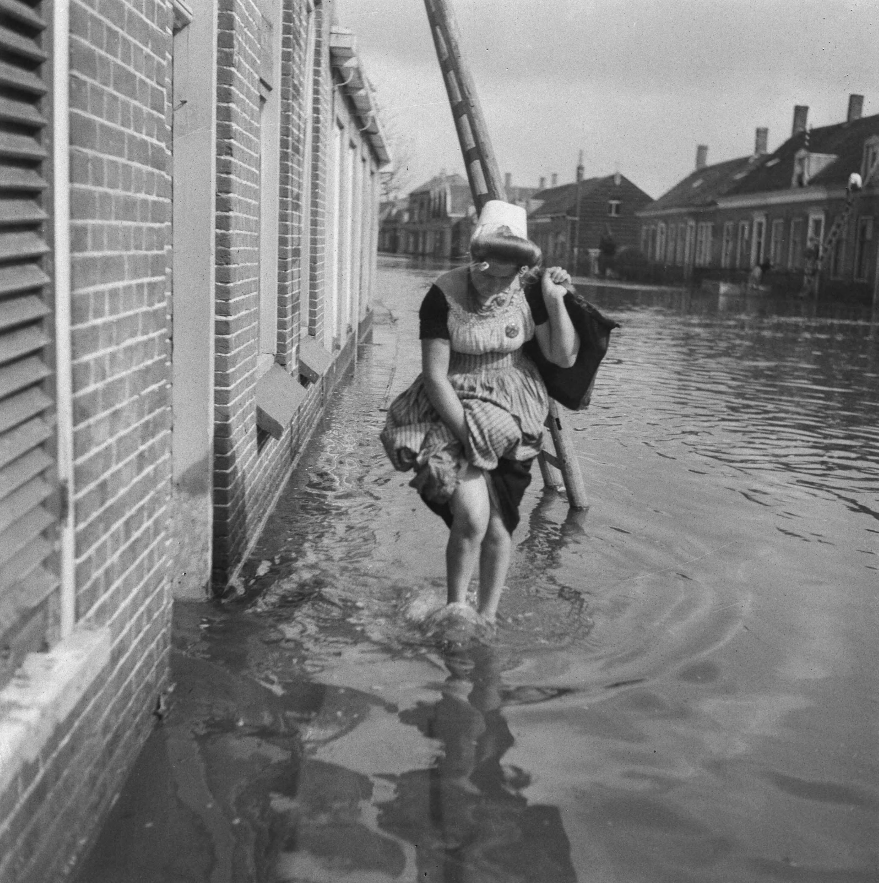 Vrouw in klederdracht loopt "pootjebadend" door een ondergelopen straat