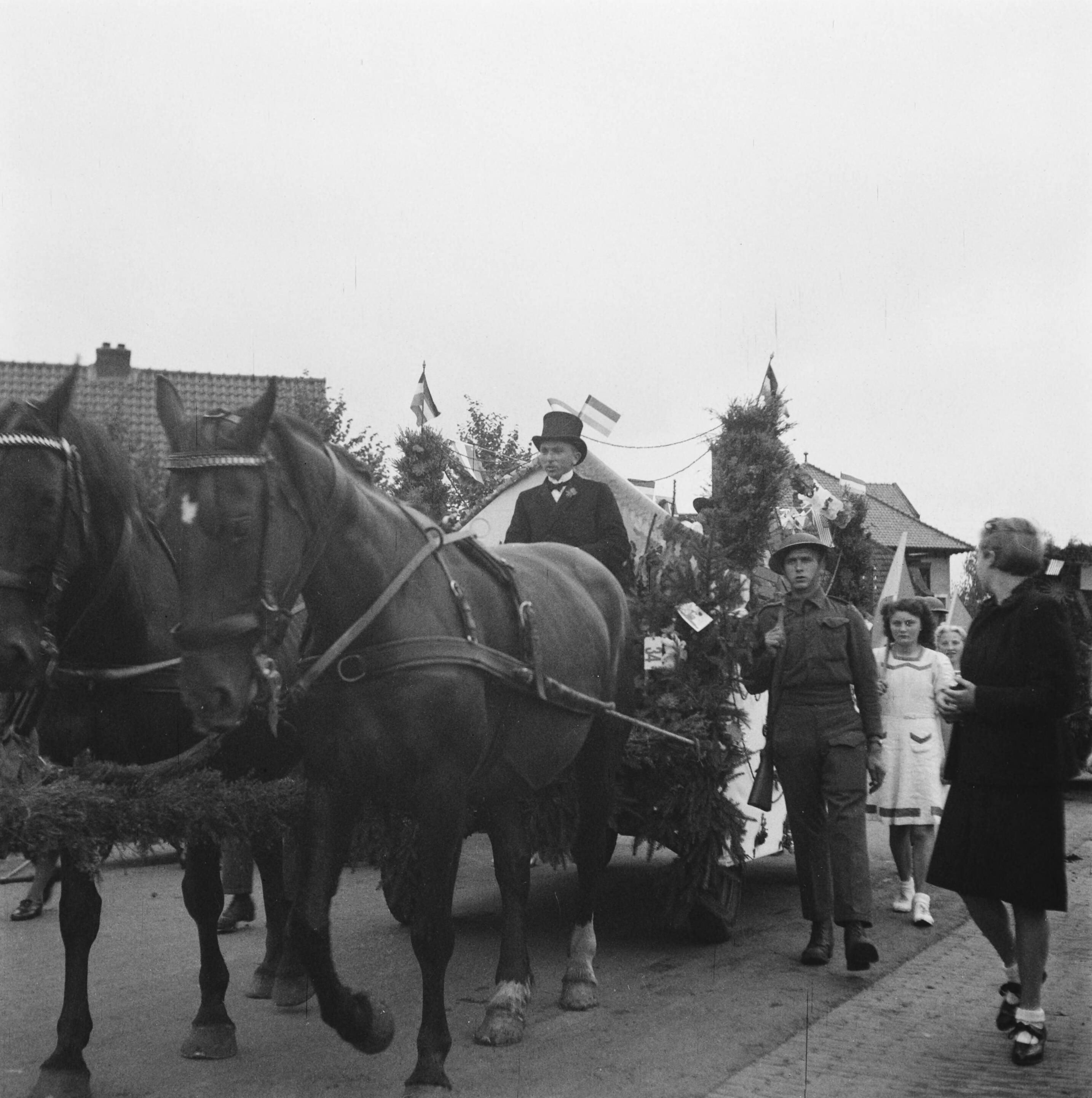 Optocht. Paard en wagen, geflankeerd door militair en meisjes met vlaggen