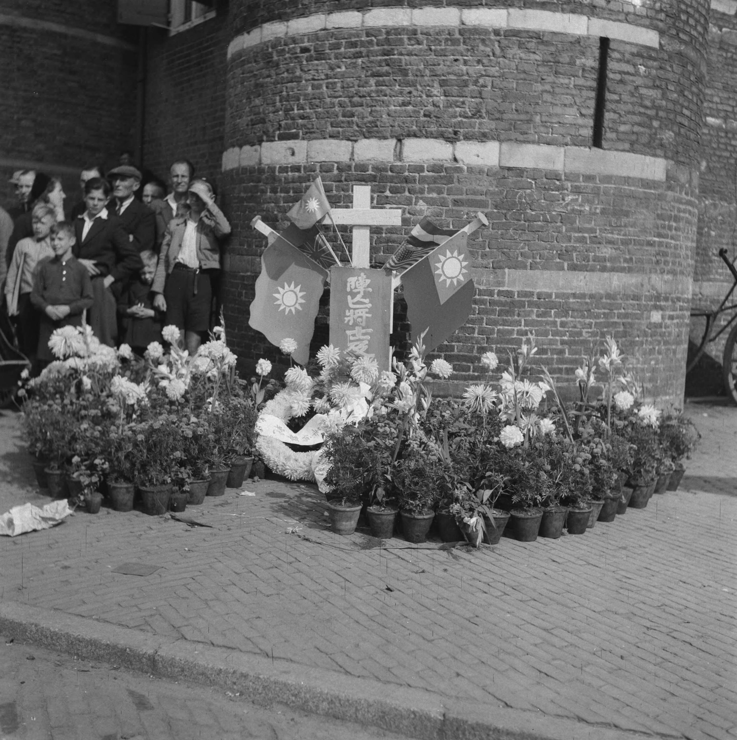 Bloemen en kransen geplaatst bij de Waag op de Nieuwmarkt