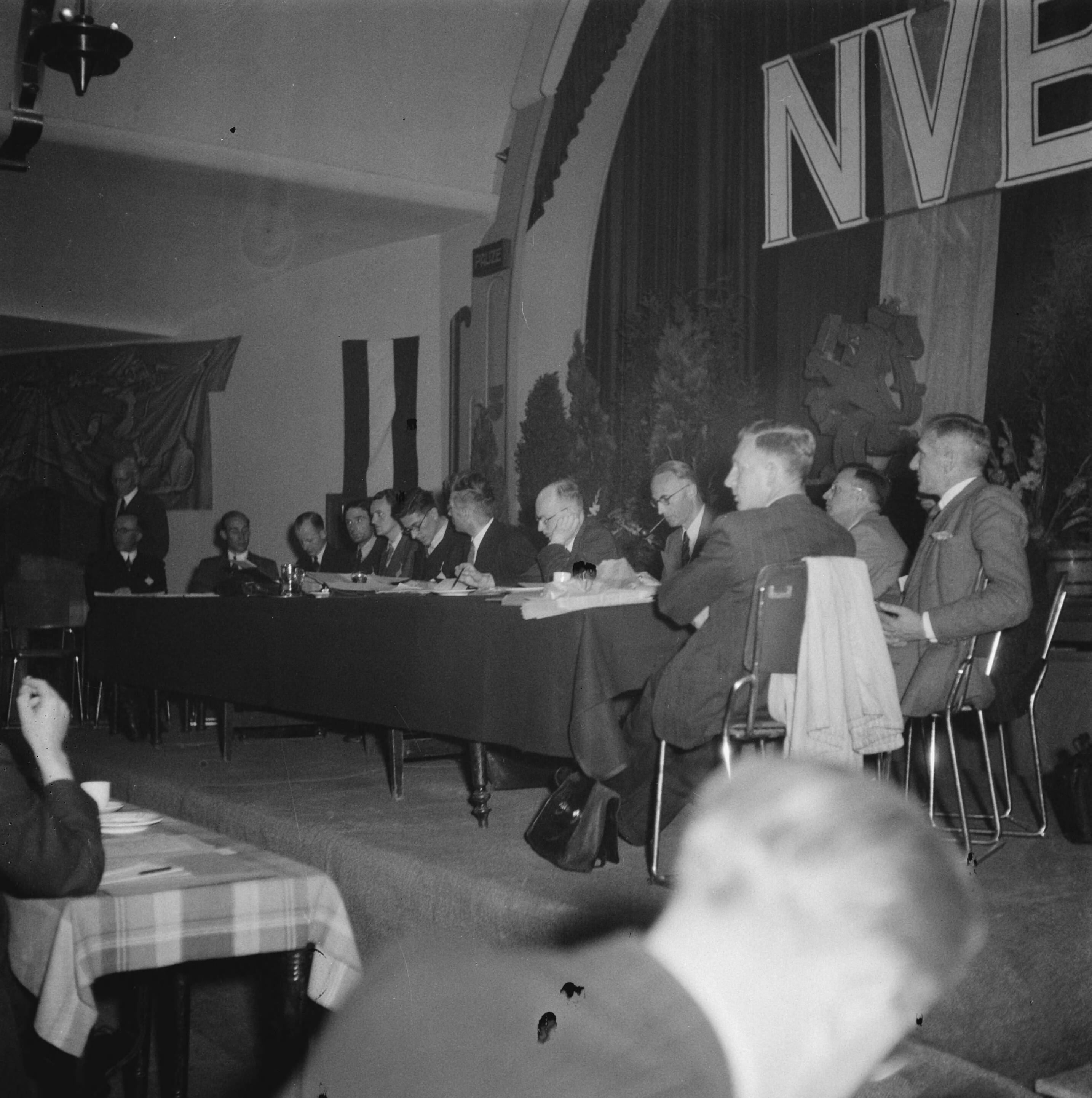 Blik op de bestuurstafel tijdens de bijeenkomst van de Nederlandse Volksbeweging