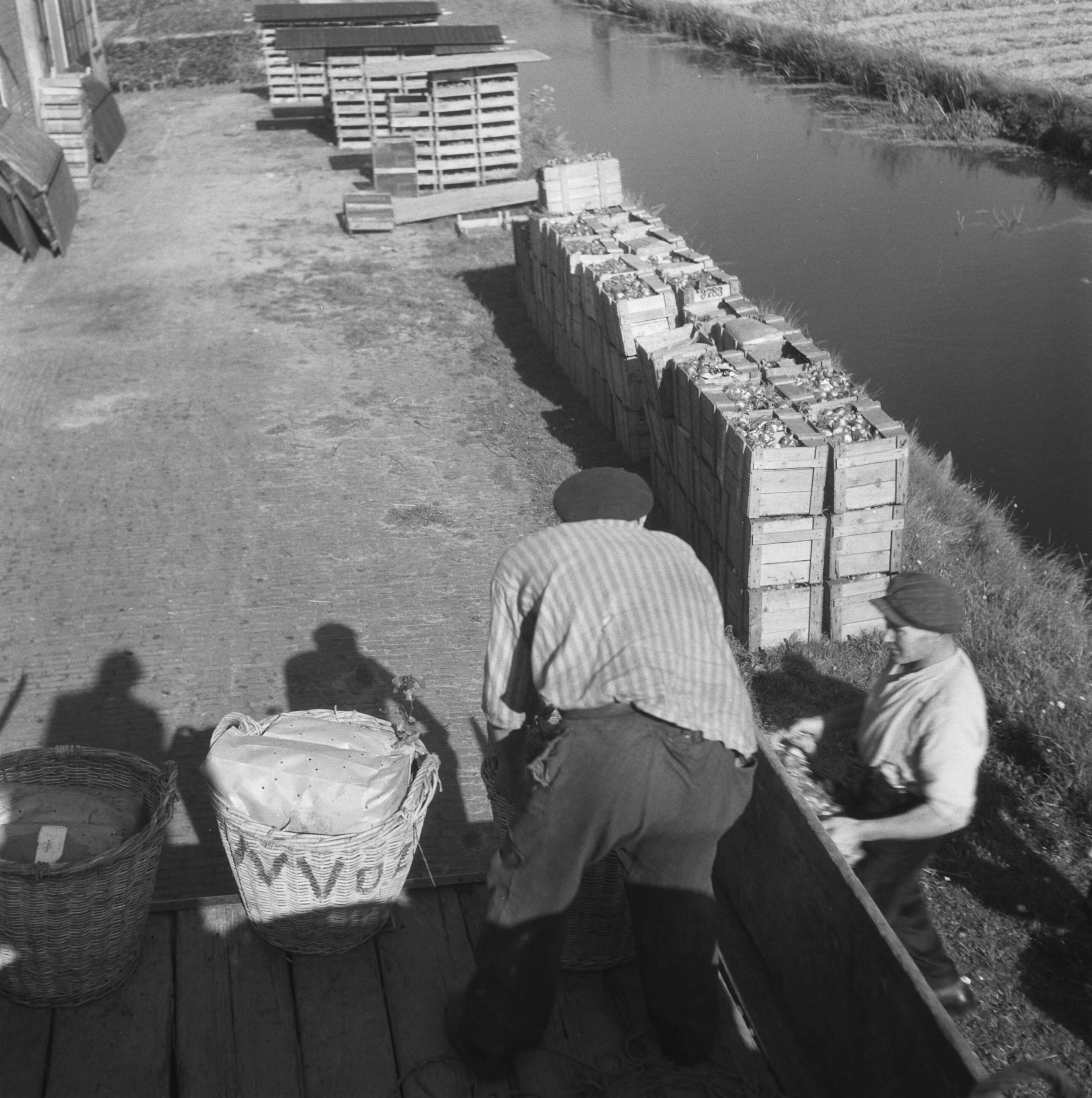 Verzamelen van manden en kisten met bloembollen en het laden in een vrachtwagen
