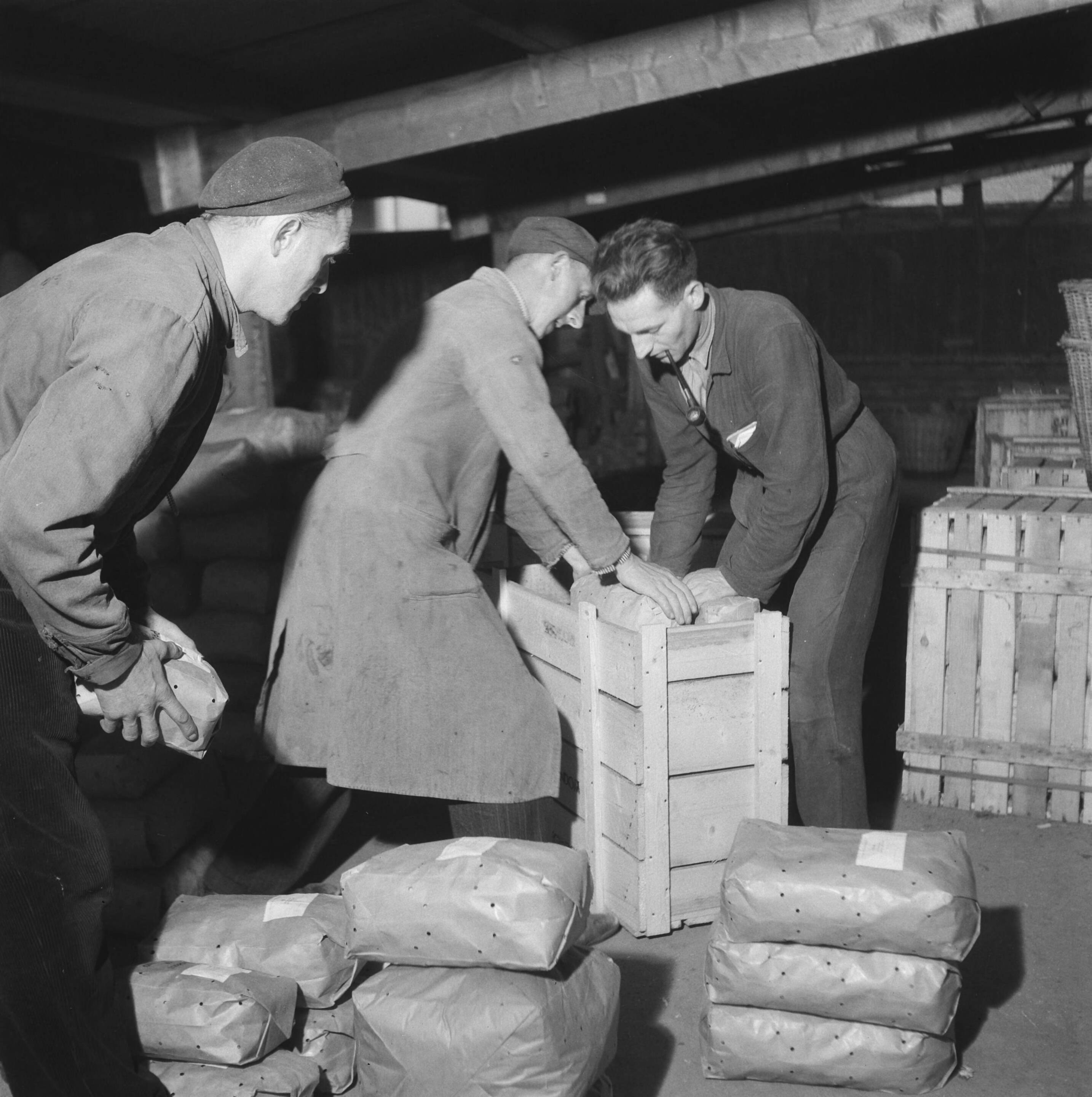 Inpakken van kisten met pakketten bloembollen